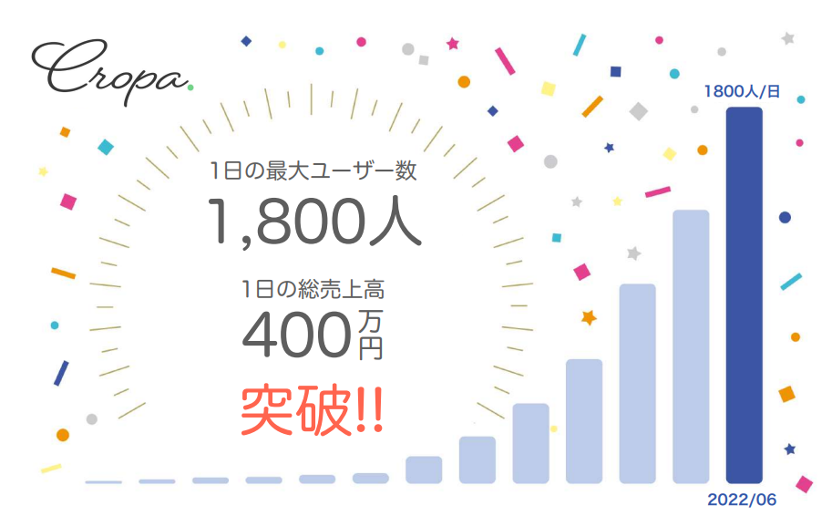 Cropaはβ版としてご利用いただき、1日の最大ユーザーが1800人、1ユーザーの1日の最大売上高が400万円を突破しました。