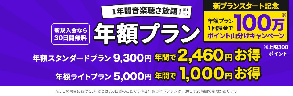 「年額 スタンダードプラン」は、「月額 スタンダードプラン」(ウェブサイトからの申し込みで30日あたり税込980円)(注1)と同様に再生時間が無制限のプランで、「月額 スタンダードプラン」12カ月分と比較して2カ月分以上(2,460円)お得になります。また、「年額 ライトプラン」は、「月額 ライトプラン」(ウェブサイトからの申し込みで30日あたり税込500円)と同様に、30日で20時間再生可能で、ライトユーザーにおすすめのプランです。「年額 ライトプラン」は、「月額 ライトプラン」の12カ月分と比較して2カ月分(1,000円)お得です。