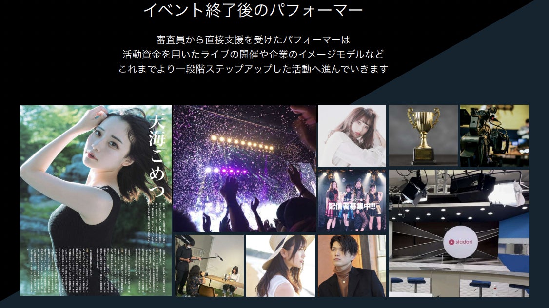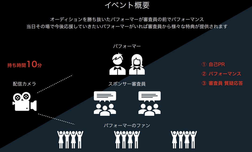 イベントではステージ審査員の前でパフォーマンスを行い、今後のアーティスト活動に必要な援助を伝えた上で、自身が出来る最高のパフォーマンスを実施します。TVのオーディション番組みたいなものと捉えて下さい。