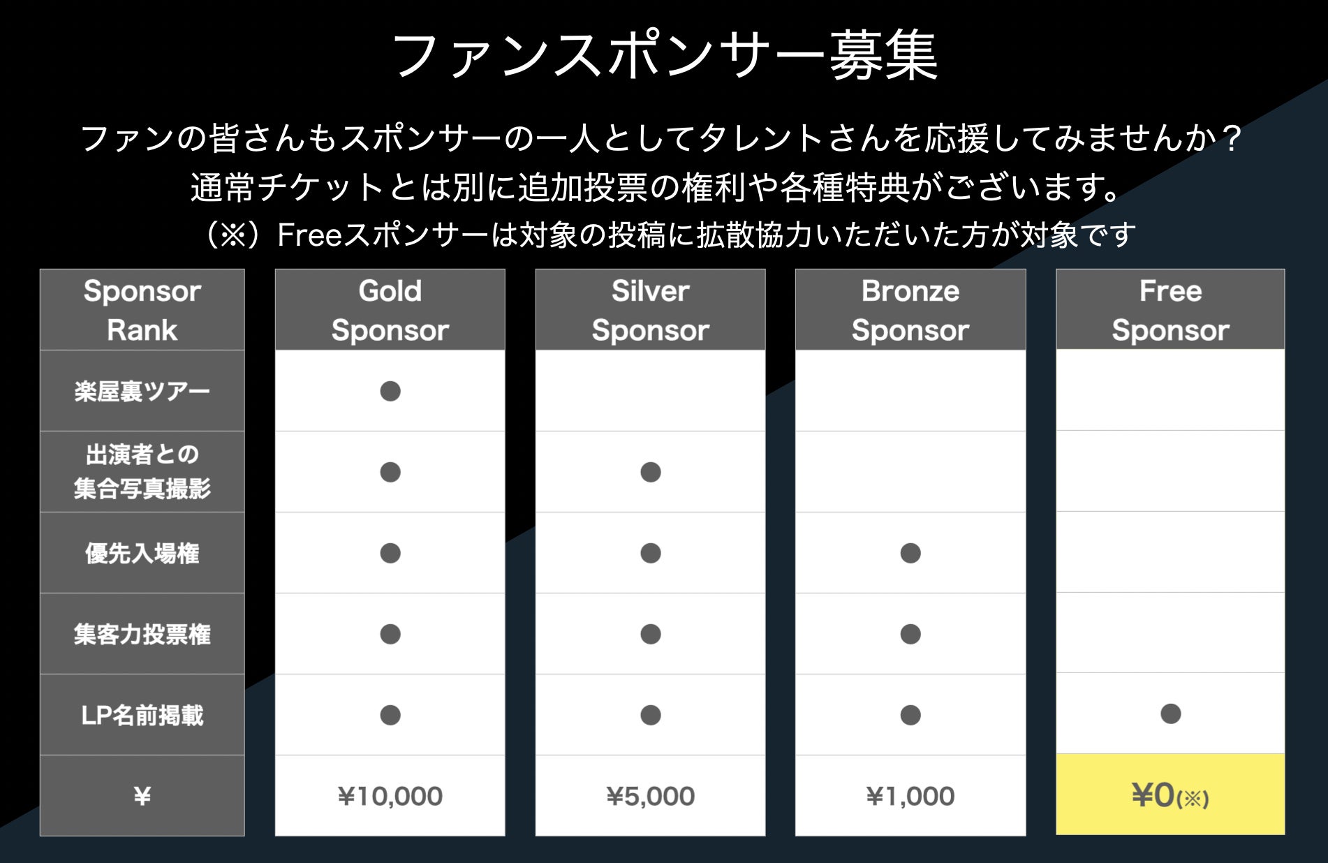 企業人だけではなく、アーティストのファンであるあなたも本イベントのスポンサーになることが可能です。