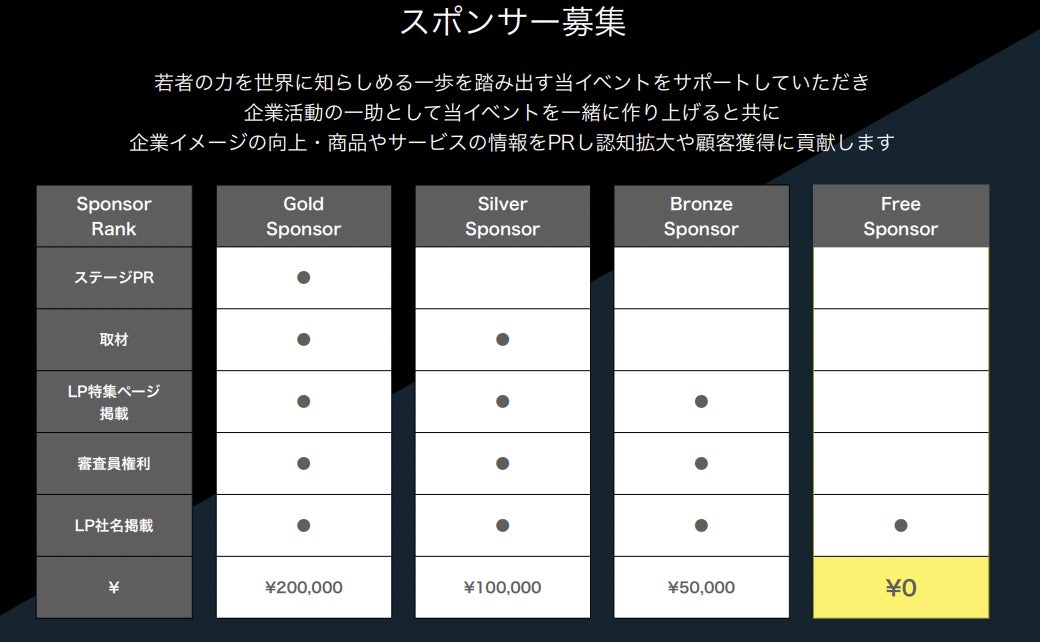 企業スポンサー同様に0円からでもスポンサーになることが可能であり、本イベントを盛り上げるための重要な位置付けとなっています。