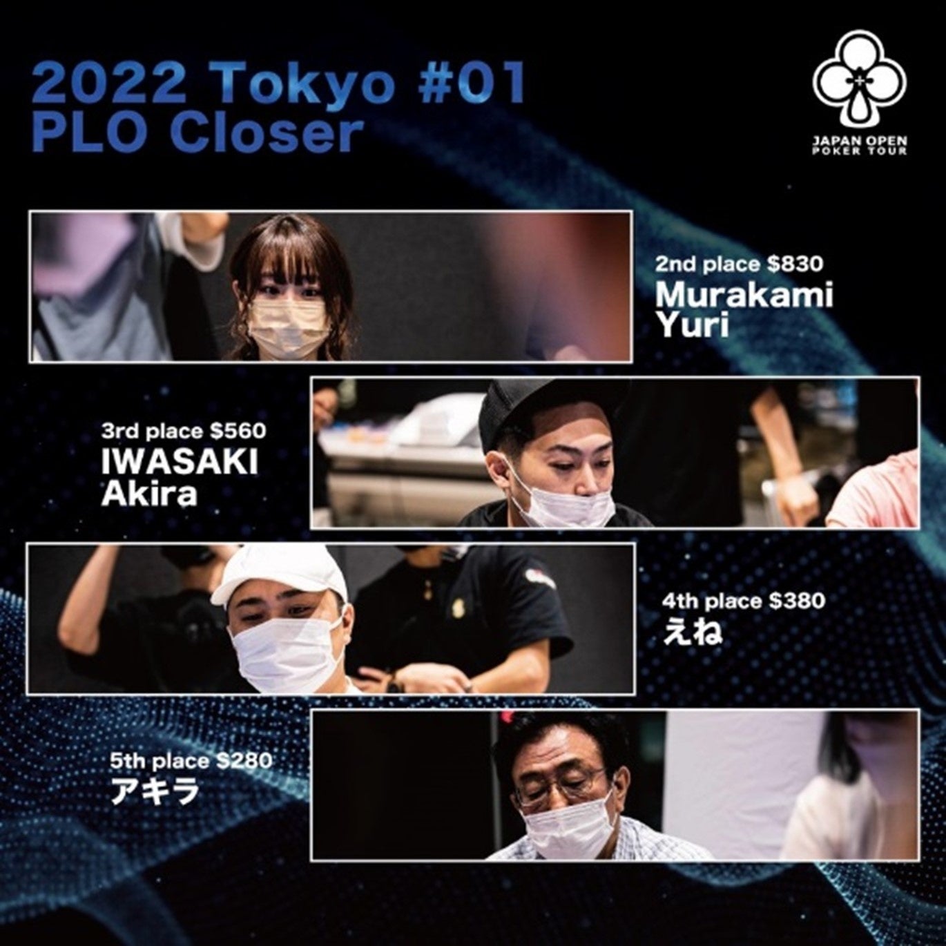 村上結梨は2022年7月18日(月)に開催された、ポーカーの日本最大級サイド大会 『JOPT / Japan Open Poker Tour 【PLO Closer】』 に出場。参加者93名間の激選を勝ち抜き、見事に2位を勝ち獲った。