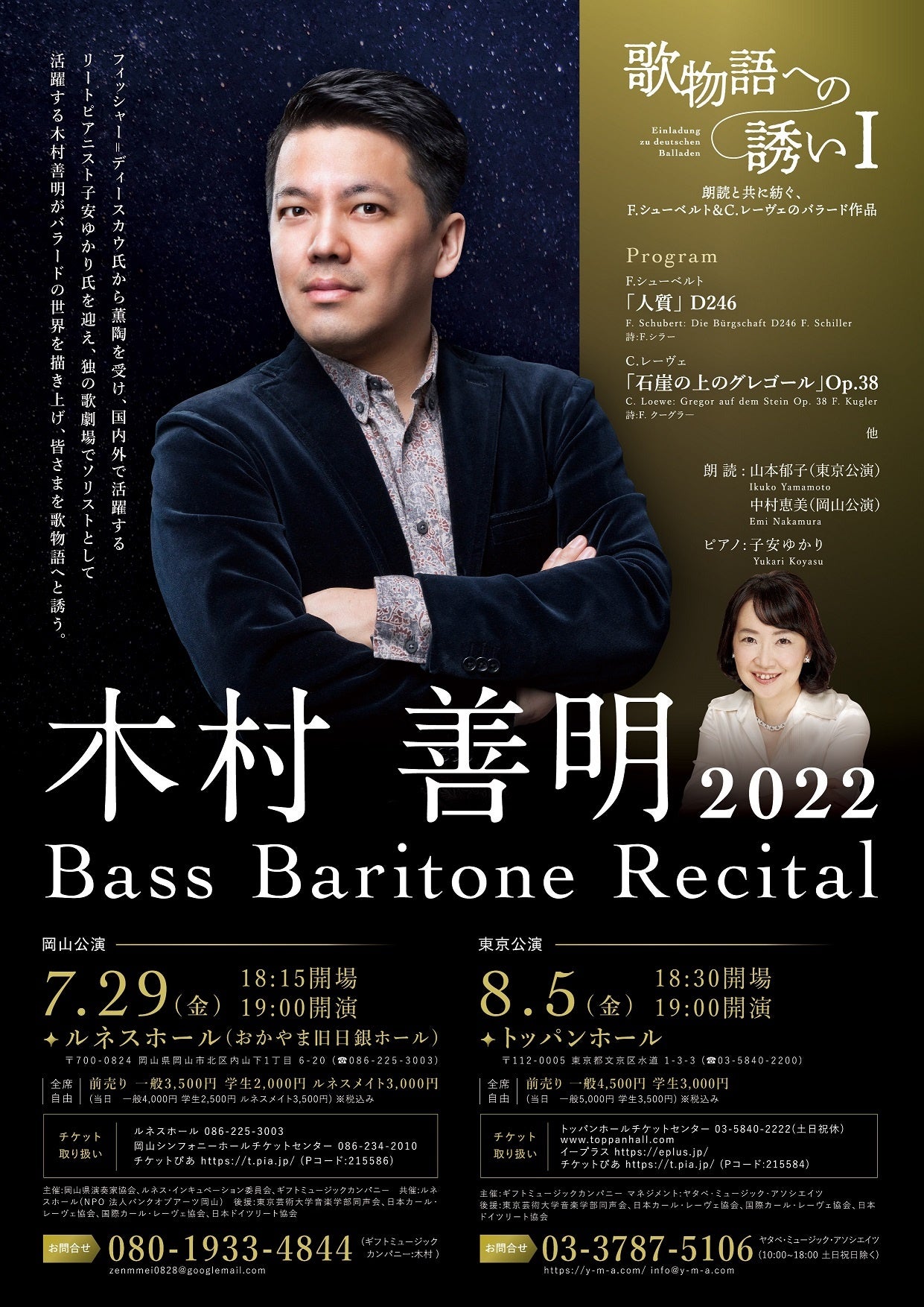 2022年8月5日(金)にトッパンホールにて「木村善明バスバリトン・リサイタル ~歌物語への誘い I ~」が開催されます(主催:ギフトミュージックカンパニー/マネジメント:ヤタベ・ミュージック・アソシエイツ)。