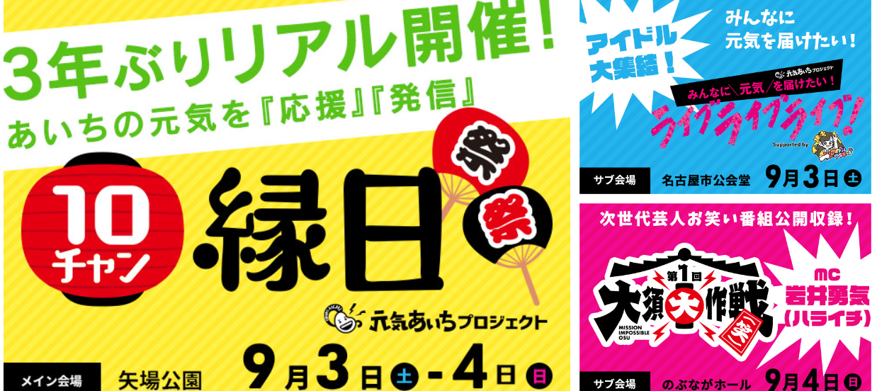 テレビ愛知は、局イベント「10チャン縁日」を3年ぶりにリアル開催します。お祭りをイメージしたメイン会場・矢場公園(名古屋市中区栄3丁目2601)では、スペシャルゲストによるライブやトークショー、番組の公開収録を行うほか、縁日屋台や人気番組のブースも設置。夜はデジタルアートが会場を彩り、‟新感覚”の盆踊り大会を開催予定。さらに、今年は2か所のサブ会場が登場!アイドルが大集結する『ライブライブライブ!』、そして『第一回 大須大作戦(笑)』と題した次世代芸人お笑い番組の公開収録を行います。