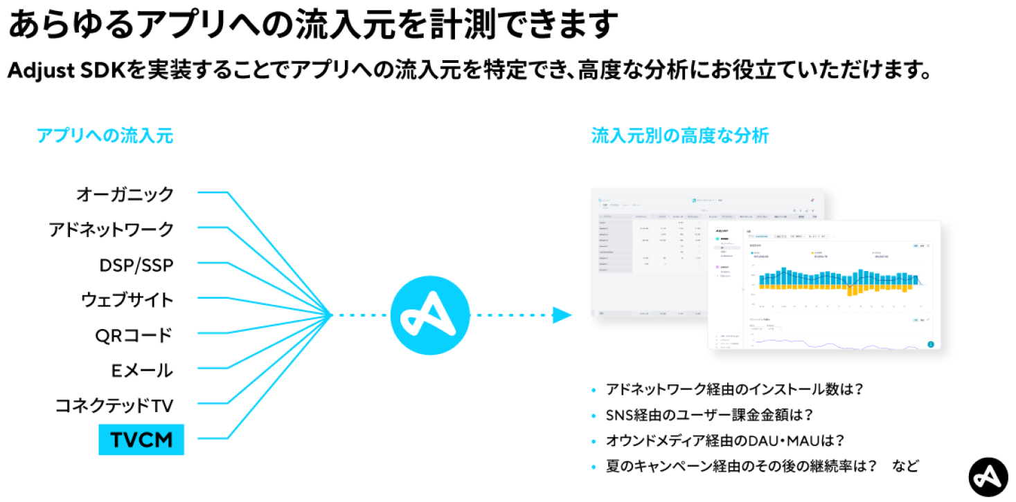 Adjust( https://www.adjust.com/ja/ )は、モバイルマーケティング分析プラットフォームです。アプリの持続的な成長を目指す世界中のマーケターから信頼されており、広告キャンペーンの効果測定と最適化、ユーザーデータを保護するソリューションを提供しています。Adjustに構築されたインテリジェンスとオートメーション技術、また迅速なグローバルカスタマーサポートが、世界中のアプリを強力にサポートしています。