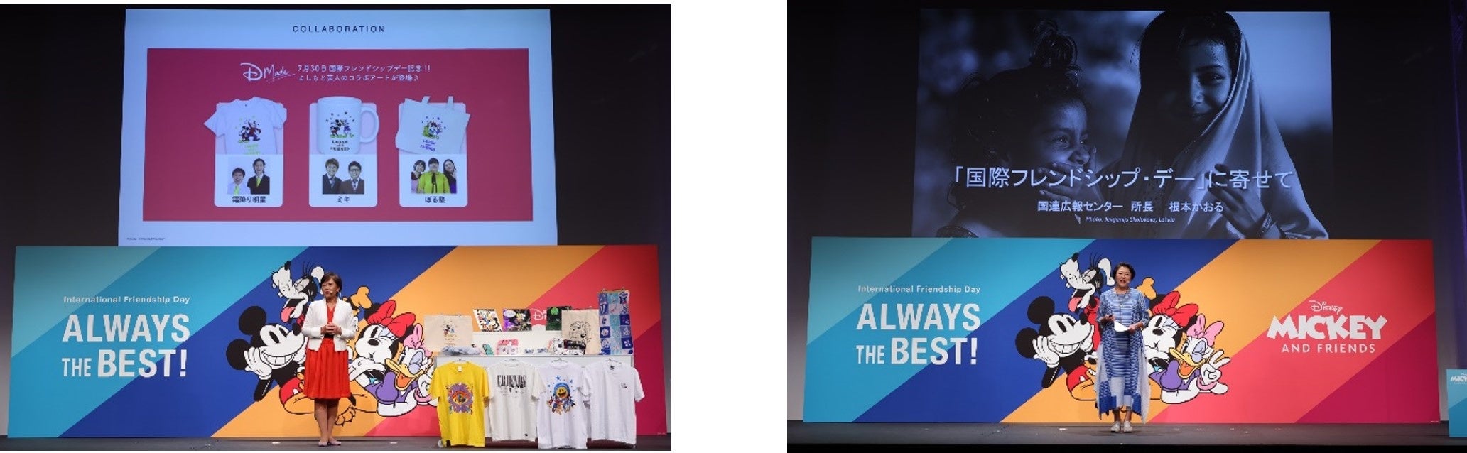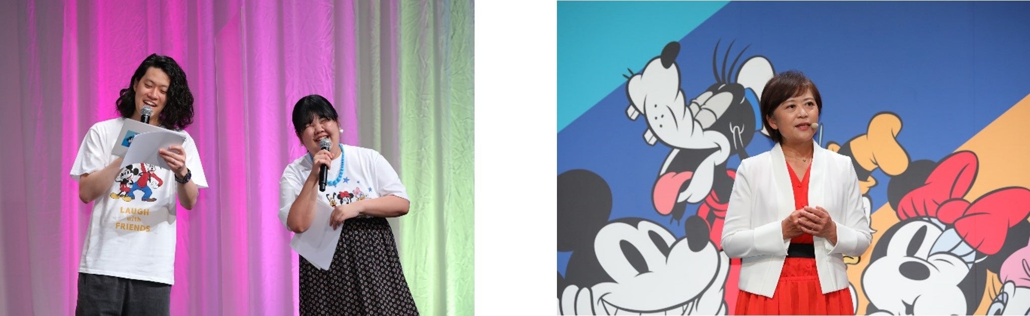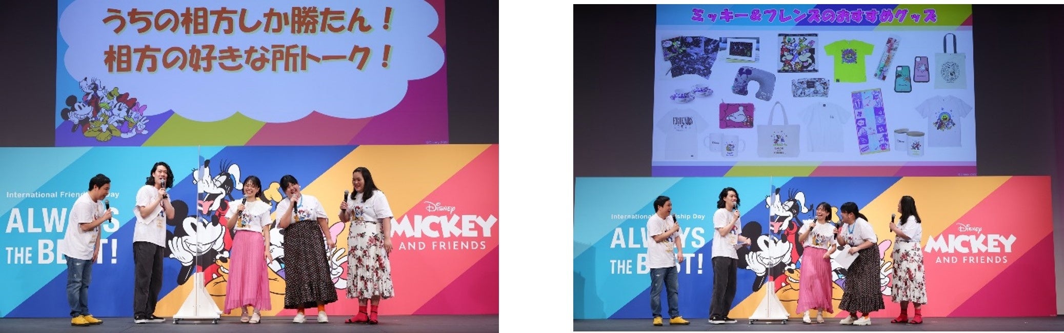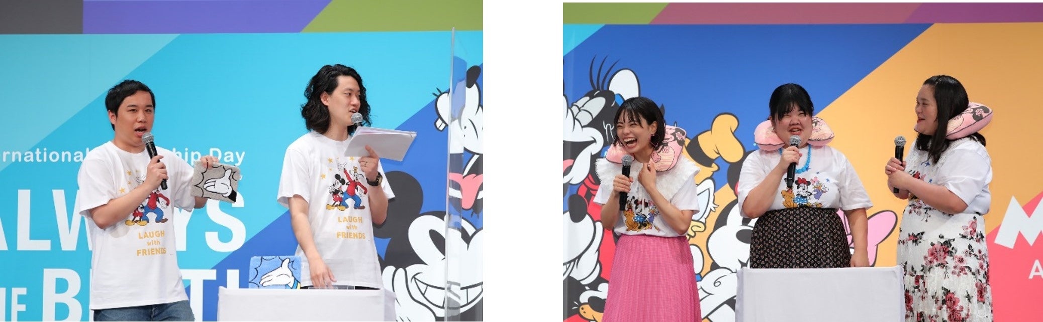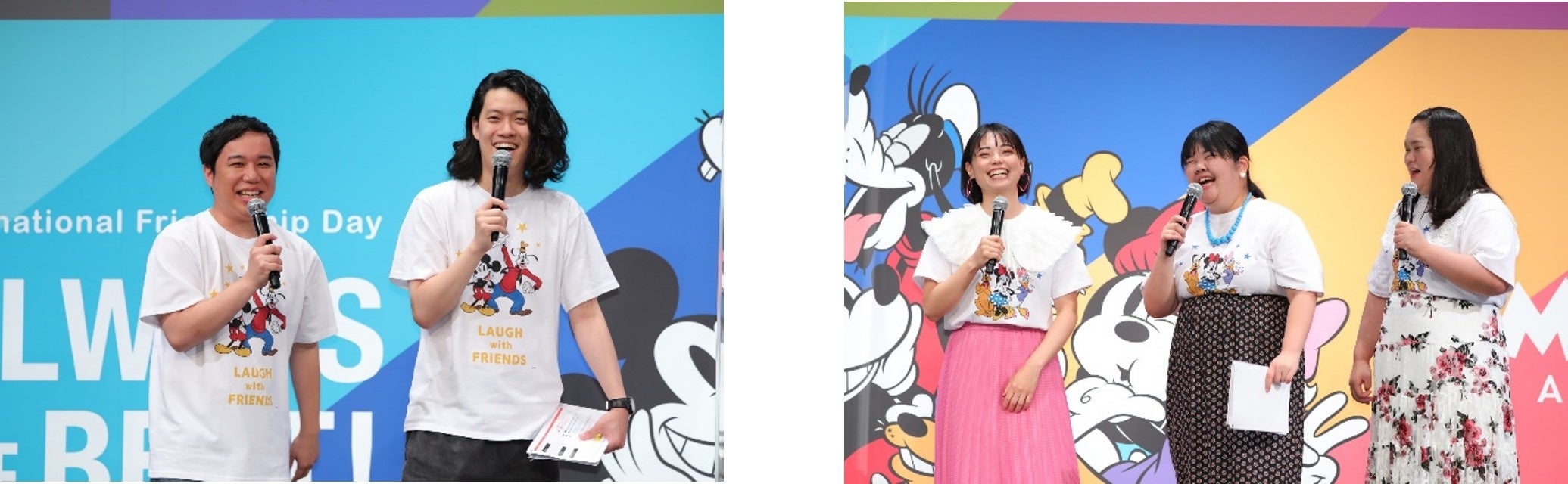 その後、ウォルト・ディズニー・ジャパン株式会社 コンシューマ・プロダクツ DTCリテール バイスプレジデント&ゼネラルマネージャーの井原多美が登壇し、ディズニーは「ギフト」と「おそろい」をテーマに「国際フレンドシップデー」を楽しむことを提案し、吉本興業とのタイアップをはじめとする実施中のキャンペーンについても説明しました。続いて、国連広報センター 所長の根本かおるさんが登壇し、国際フレンドシップデーの今日的な重要性や国連としてのメッセージについてプレゼンテーションを行いました。プレゼンテーションを聞き、あんりさんは、「友達を大事にしようと思いました。友達には芸人も多いですし、相方も友達です。」とコメントし、粗品さんも「せいやとは高校の時からの友達ですからね。」と、お互い友達を大切にしているねとコメントをしました。