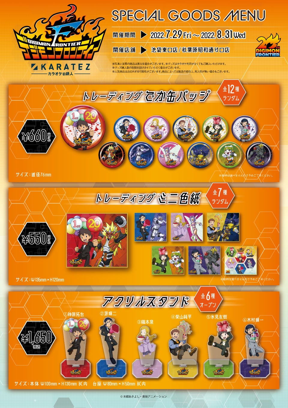 株式会社鉄人化計画(所在地:東京都目黒区、代表取締役社長:根来拓也)は、当社が運営する「カラオケの鉄人」の首都圏4店舗において、TVアニメ『デジモンフロンティア』(東映アニメーション株式会社 代表取締役社長:高木 勝裕)の放送開始20周年のアニバーサリーイヤーを記念したコラボレーションキャンペーン(以下「コラボ」)を、2022年7月29日(金)より開催します。