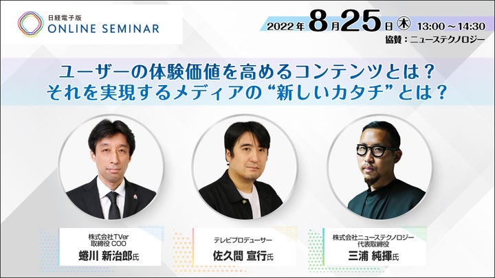 近年、動画配信サービスの普及などにより、メディアやコンテンツが多様化する中、ユーザー体験に寄り添うメディアやコンテンツの在り方が注目されています。新たな時代にユーザーの体験価値を向上させるコンテンツとは何か?それを実現するためにメディアはどう寄り添っていくのか?テレビプロデューサー 佐久間 宣行氏、TVer取締役 蜷川 新治郎氏、ニューステクノロジー代表 三浦が、最新事例と併せて、それぞれの視点で議論します。