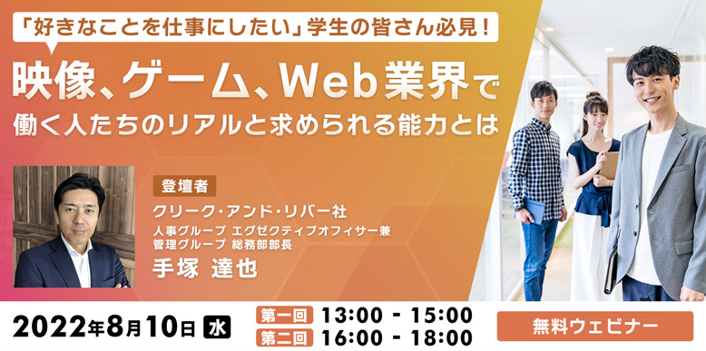 株式会社クリーク・アンド・リバー社(C&R社)は8月10日(水)、大学・大学院・専門学校に通う学生の方々を対象に、無料セミナー「映像、ゲーム、Web業界で働く人たちのリアルと求められる能力とは」を、会場(福岡)とオンラインのハイブリッドで開催いたします。