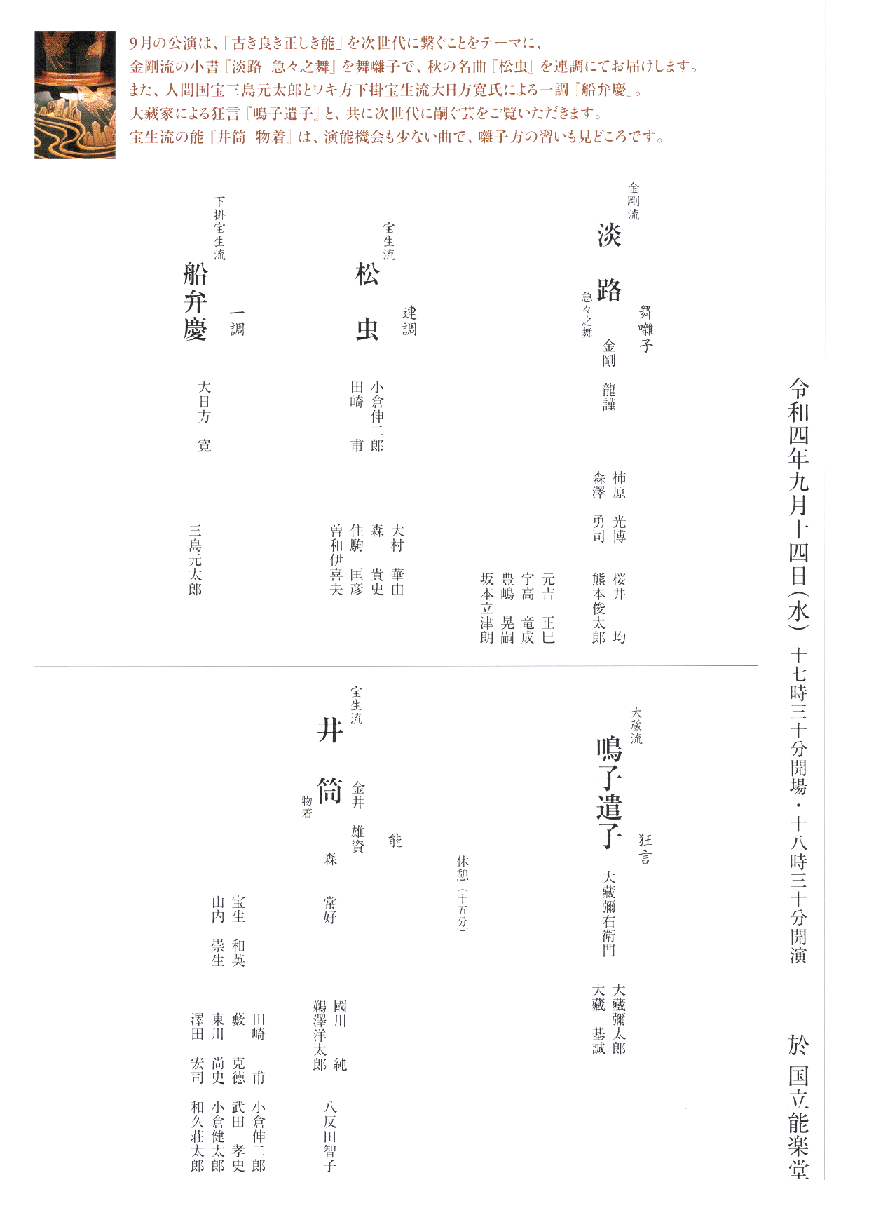 【能】宝生流〈井筒 物着〉: 金井雄資、森常好、宝生和英、山内崇生、武田孝史、小倉健太郎、小倉伸二郎、和久荘太郎、澤田宏司、東川尚史、藪克徳、田崎甫、八反田智子、鵜澤洋太郎、國川純