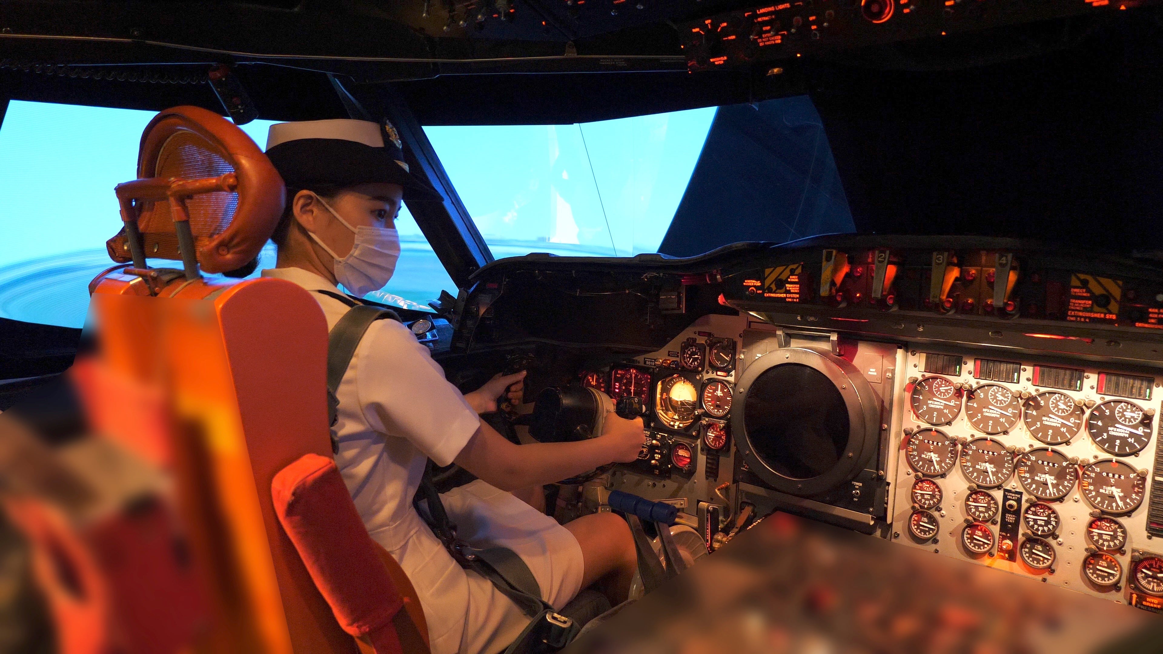 吉田さんは第203教育航空隊にて教官の後藤1等海尉より、部隊の任務について話をうかがった後、OFT(操縦訓練装置)にて、都内上空を体験飛行した。