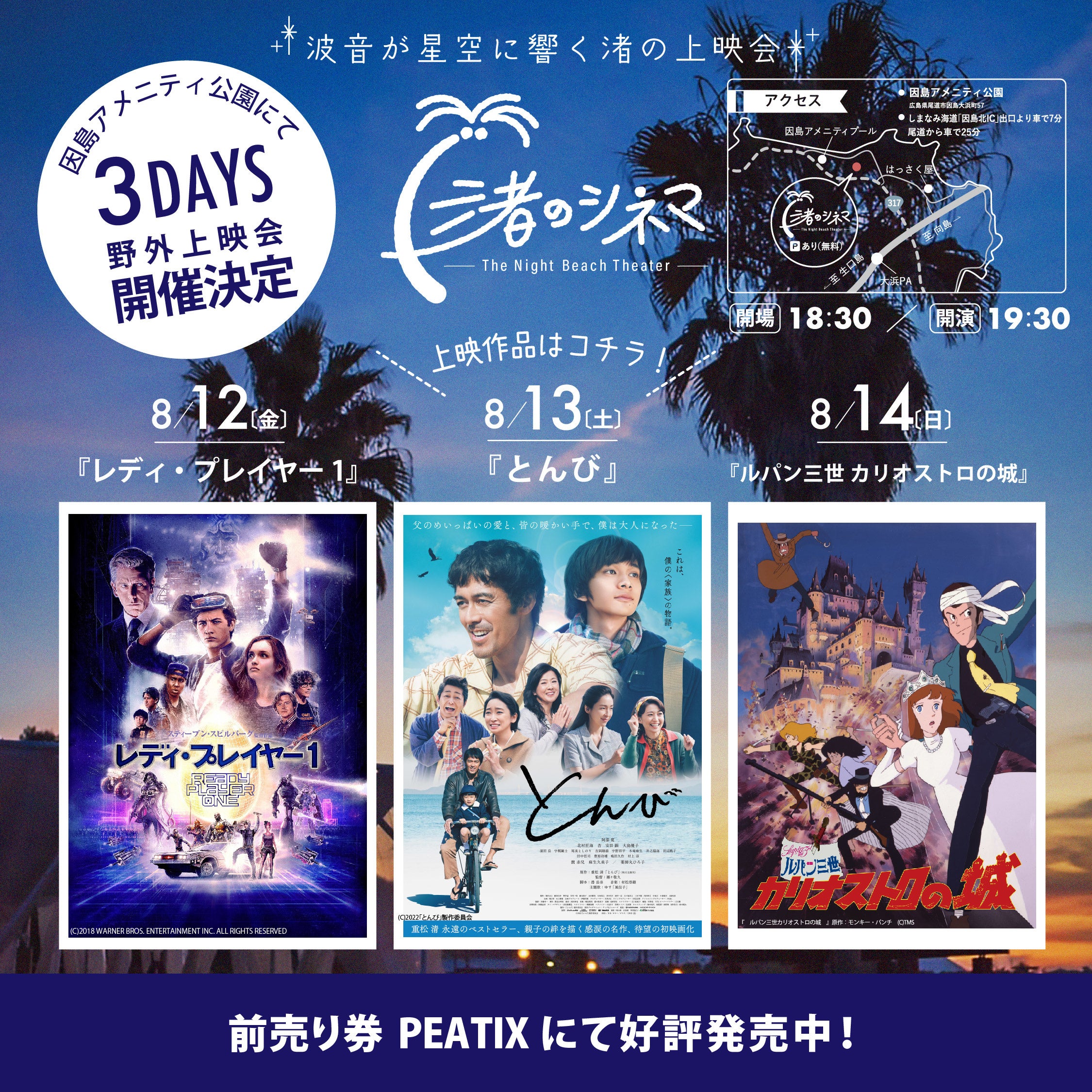 『渚のシネマ』は地域の皆様に「特別な思い出」と「日常の風景の素晴らしさ」をお届けするために因島アメニティ公園で3日間、野外映画上映会を実施します。