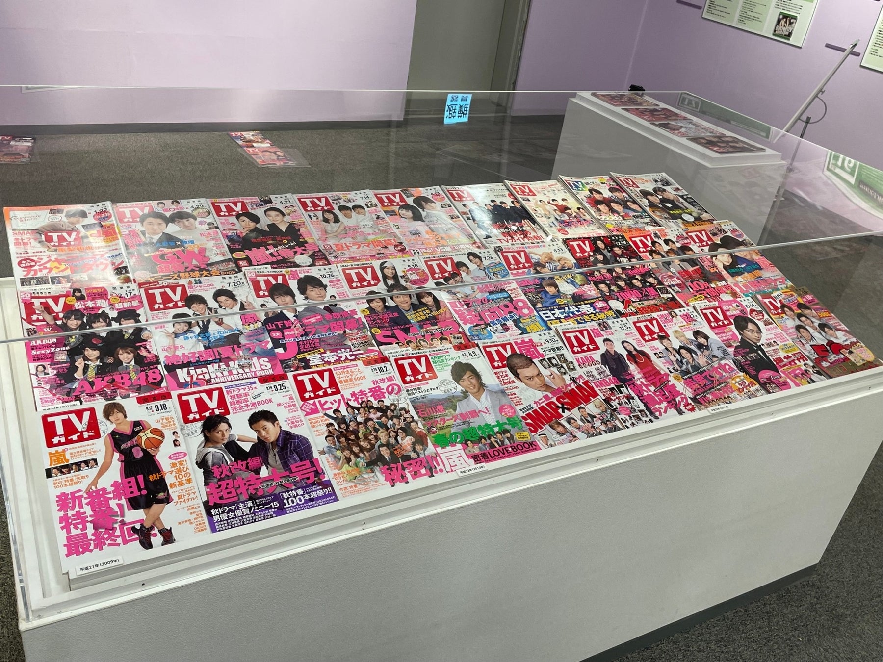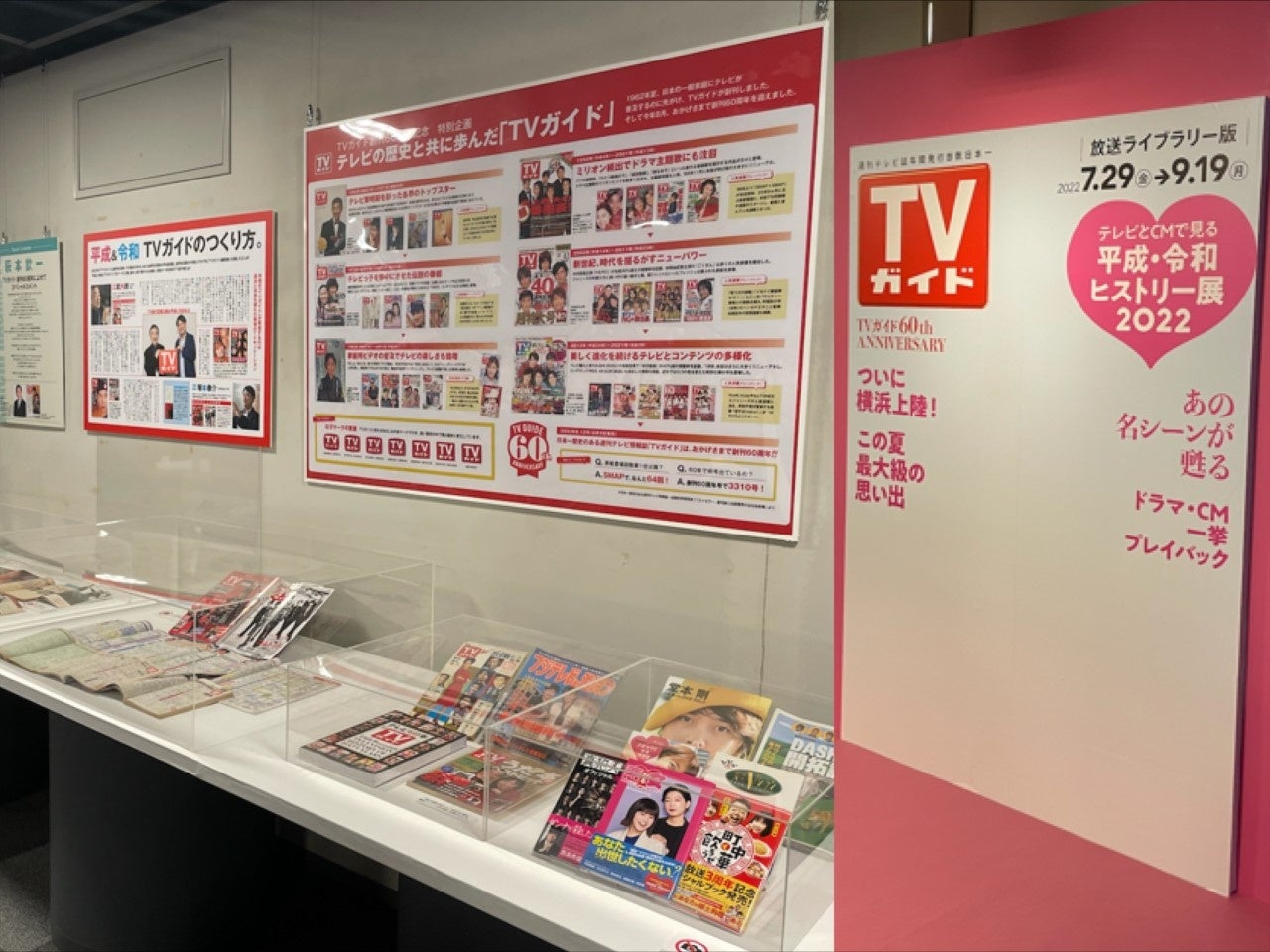 さらに、企画展内TVコーナーでは、平成から令和にかけて発行された200冊を超える「TVガイド」を展示! 「TVガイド」の表紙から、TVの歴史を紐解くことができるようになっています。懐かしのあの表紙も見られるかも?!