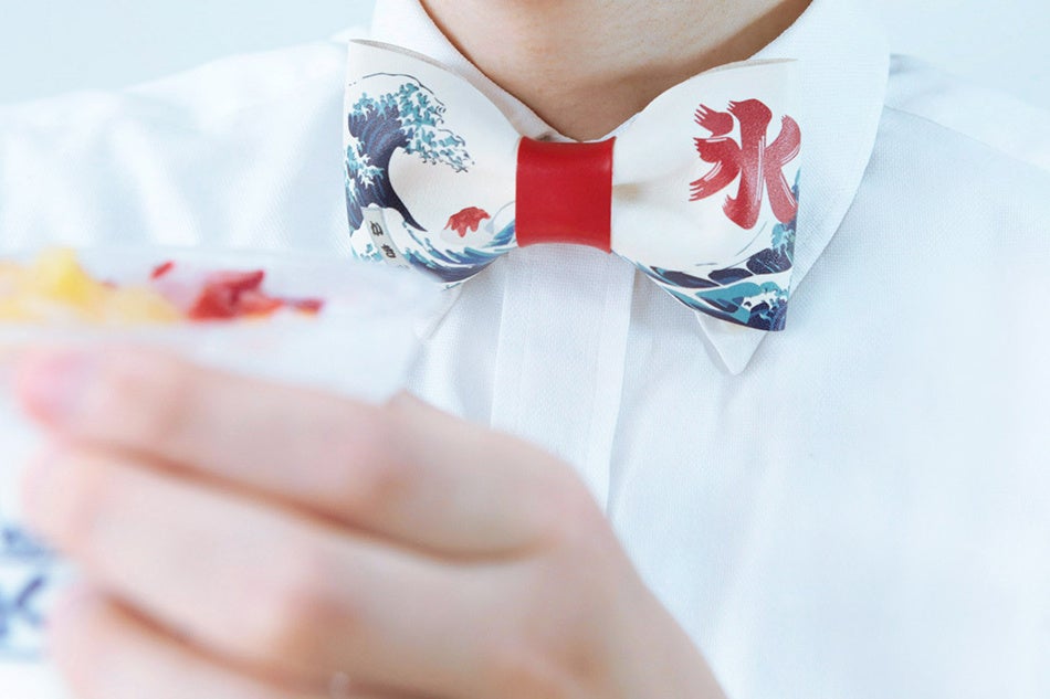 夏のひんやりスイーツかき氷が蝶ネクタイとなって首元を爽やかに彩ります。思わず「かき氷の蝶ネクタイや〜」と叫びたくなりますね。