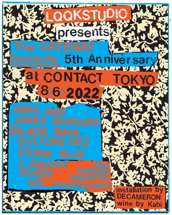 この度Domicileは、オープン5周年を記念してニューヨーク・ブルックリンを拠点にするプリントスタジオLQQKSTUDIOを迎え、8月6日にポップアップストアと周年記念パーティを開催。LQQKSTUDIOはニューヨークを中心に、スケートブランドのTシャツから有名レストランのメニュー、現代アーティストの作品制作やコレクションブランドのランウェイに至るまで様々なミディアムのプリントを手がけており、コミュニティーからの絶大な信頼を集めるシルクスクリーンに特化したプリントスタジオである。 ポップアップストア開催と、Domicile5周年を祝す今回の来日では渋谷Contactのクロージングを受け、2016年、2017年と過去2回開催されたThe Gateway名義でのパーティに引き続き同会場では最後となる第3弾を決行。2016年には〈L.I.E.S Records〉からNGLY、Person of Interest、Vereker、〈Allergy Season〉からMax McFerren、 2017年には同ビルの廃駐車場でのポップアップを開催し空間デザインはアーティストYoshirotten、ビジュアルデザインは3DアニメーションスタジオCutlureSport.TVが担当、サウンドはシカゴハウスのレジェンドTraxx、 〈Confused House〉からSteve SummersとBookworms、〈Domino Records〉からMotion Graphicsを引き連れ凱旋。音楽、アートなどジャンルの垣根を超えるこのイベントは、ニューヨークで実際に体感している空気を東京の人々と共有したいとLQQKSTUDIO主宰の願いが込められ、The Gatewayと名付けられた。 今回は今、アメリカ東海岸で再燃したエレクトロニック音楽における新しいムーブメントに焦点をあて新鋭DJコレクティブ〈Black Rave Culture〉からメロディーサンプリング担当、ワシントンDCアンダーグラウンドヒップホップシーン叩き上げの最年少メンバーAMAL と、パーカッションとプロディース力に長け、〈Mister Saturday Night〉を始めDJ Pythonの〈Incienso〉など数々のレーベルから楽曲をリリースし、Pitchforkでは「Best Mix of 22’」に選ばれたJames Banguraの二人を招集、現在ブルックリンを拠点に活動しBen Hixonと共にテキサスハウスの新鋭、マルチメディアアーティストのStonie Blue、「Trilogy Tapes」やLQQKSTUDIOの〈369 Recrods〉からもレコードをリリースしているア ーティストJ. Albertがラインアップに参戦。ブラック・レイブ・カルチャーとは何なのか ワシントンDCサウンドのゴーゴーやバウンス、ジャージークラブ、ビーモア、ジューク、フットワーク、ドラムンベース、ジャングル、ダブステップ、テクノ、ハウスやゴムまで世界中のダンスミュージックスタイルへの理解を示す彼らの生み出す音楽は一体どういう音なのか、約5年ぶりに来日する LQQKSTUDIOのThe Gateway、現行で起きている次世代ブラック・エレクトロニック・ミュージッ クムーブメントの”扉”を開けにContactに集合しよう。 日本勢からは国内外のアンダーグラウンドミュージシャンのリリースを行うカセットレーベル〈Birdfriend〉、コンテンポラリー/ 電子音楽をリリースするレーベル〈NAKID〉主宰、日野浩志郎によるソロプロジェクトYPYによるライヴセットや大阪Newtone Recordsのバイヤーを務め数々のイベントやフェスでDJプレイを魅せるAkie、更にロックバンド、the hatchの作詞曲、Vo.Tb.Key担当 midoriによるDJ セット。Domicileから MONKEY TIMERS主宰のDISKO KLUBBに所属し、東京渋谷のクラブ翠月にてレジデントDJ とブッキングを担当してい るYamarchyと2019年に結成依頼、東京のクラブシーンで活動しているDJコレクティブVynl YouthのKamome がサポートに入る。 会場内のインスタレーションは2020 年に新宿歌舞伎町の中心地に開廊したアートギャラリーDecameronがサポート、今回はFoyerスペースでのインスタレーションを展開しスタンドではギャラリーの一階で出しているスペシャルカクテルを提供。さらにシェフ安田翔平とソムリエ江本賢太郎により 2017 年にオープンしたレストラ ンKABIから、ソムリエの竹内直人がキュレーションしたワインスタンドも出店される。フライヤーデザインはマサチューセッツ州在住のアーティストB. Thom Stevensonが手掛け、アーティスト仲間のロサンゼルス在住Jason S Wrightと共に立ち上げた今話題の炭酸水飲料ブランドMiracle Seltzerから炭酸水が提供される。 同日の夕方、Domicile東京では今回の来日を記念した限定アイテムを販売予定、シグネイチャーとなるボックスロゴシリーズやブランド設立のきっかけとなった140 SHOP LS Tシャツの新色ヴァージョンなどの定番アイテムを始め、ブランドの立ち上げ当初に販売していたオリジナルプリントロゴの復刻フーディーを限定100枚販売、キャンバーのスナップバックボタンになってから初となるオリジナルロゴなどLQQKSTUDIOファンは垂涎もののラインアップを販売予定。