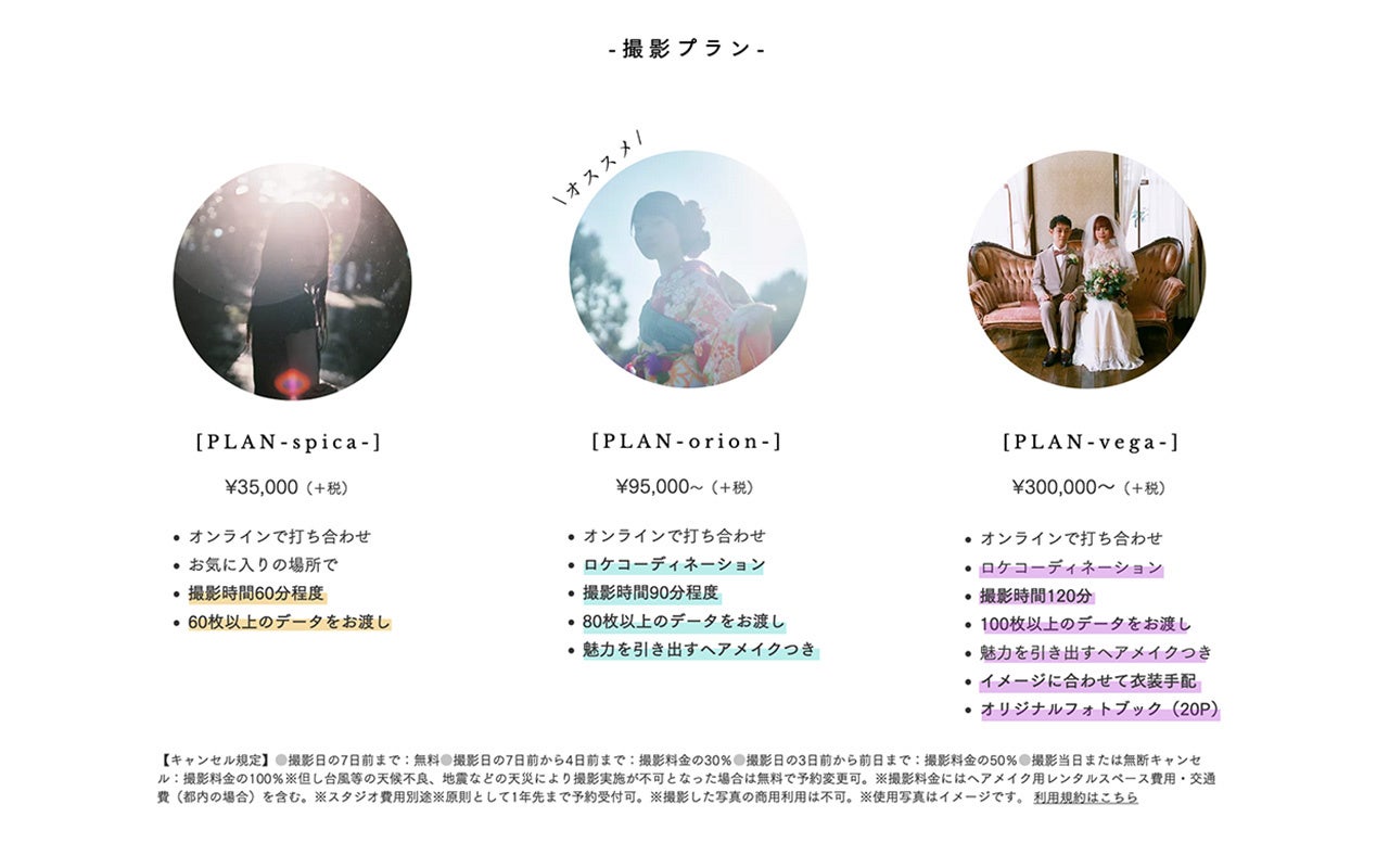 お気に入りの場所とお洋服で撮影するカジュアルなプランから、ロケーション・衣装・ヘアメイクのすべてをプロがディレクションする豪華プランまで、あなたにぴったりの撮影プランをご提案します。