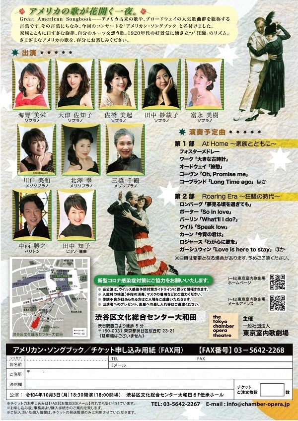 一般社団法人東京室内歌劇場主催、『アメリカン・ソングブック ~Good Old America~』が2022年10月3日 (月)に渋谷区文化総合センター大和田6F 伝承ホール(東京都渋谷区桜丘町23-21)にて開催されます。