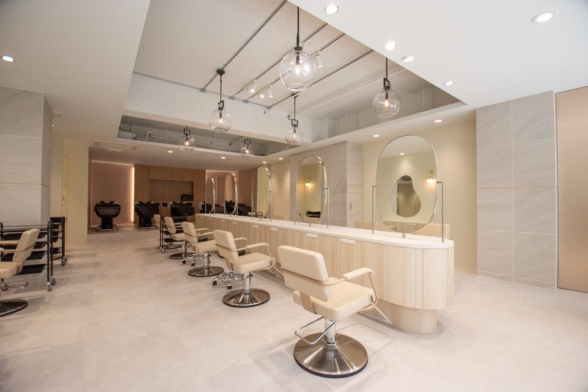 「自信と美しさを磨いてくれる美容室」をイメージし、受付カウンターには自然が創り出す美しさを活かした天然石を使用。曲線を随所の造形の基本とし、明るい空間に上品なゴールドの色味をポイントで加えることで女性的な空間に。各セット面のミラー形状にも変化をつけることで、何度ご来店いただいても多様な背景で写真が撮れるようなデザインにいたしました。今回デザイン&施工を担当した株式会社LARGOは、「明日、エピソードになる空間を。」をタグラインに掲げ、数多くの人気サロンを生み出している今最も注目のデザインスタジオです。