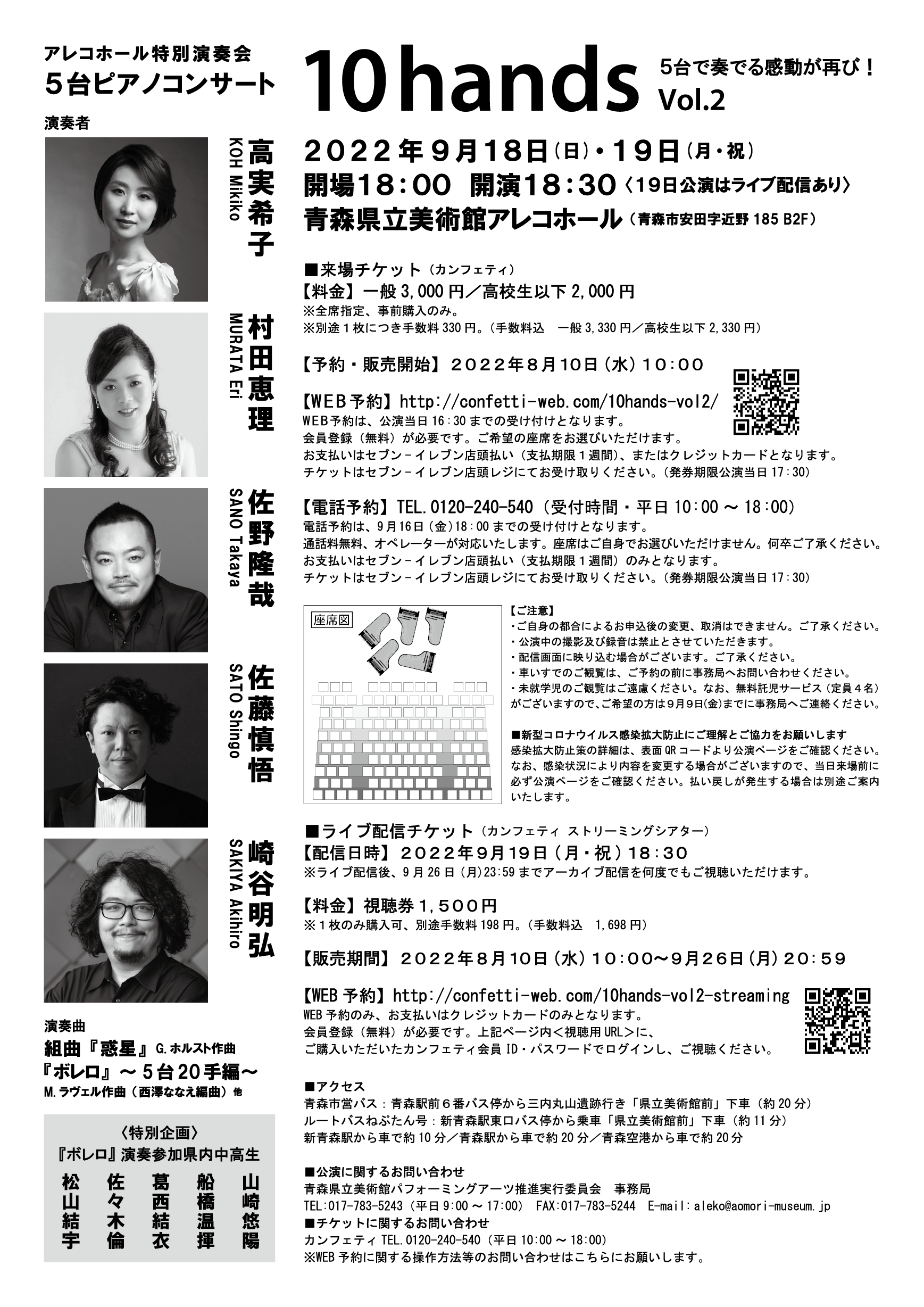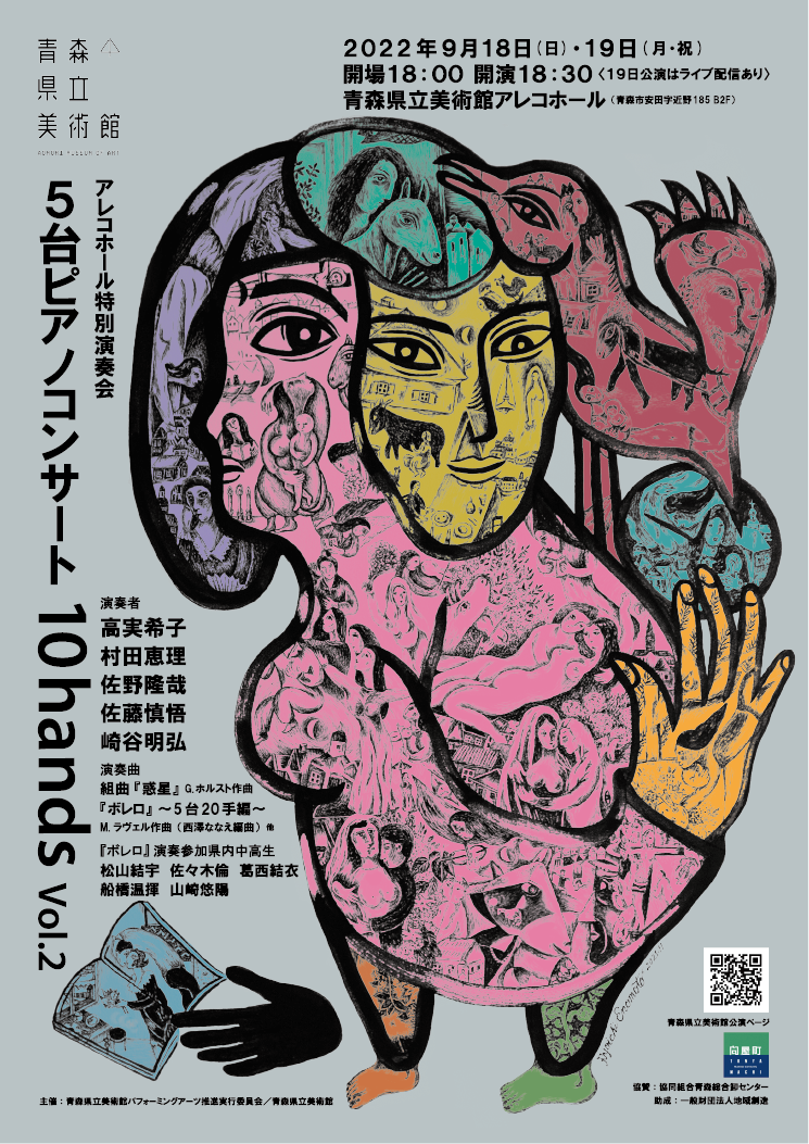 青森県立美術館パフォーミングアーツ推進実行委員会・青森県立美術館主催、アレコホール特別演奏会 5台ピアノコンサート「10hands Vol.2」が2022年9月18日(日) ・ 19日(月祝)に青森県立美術館アレコホール(青森市安田字近野185 B2F)にて開催されます。