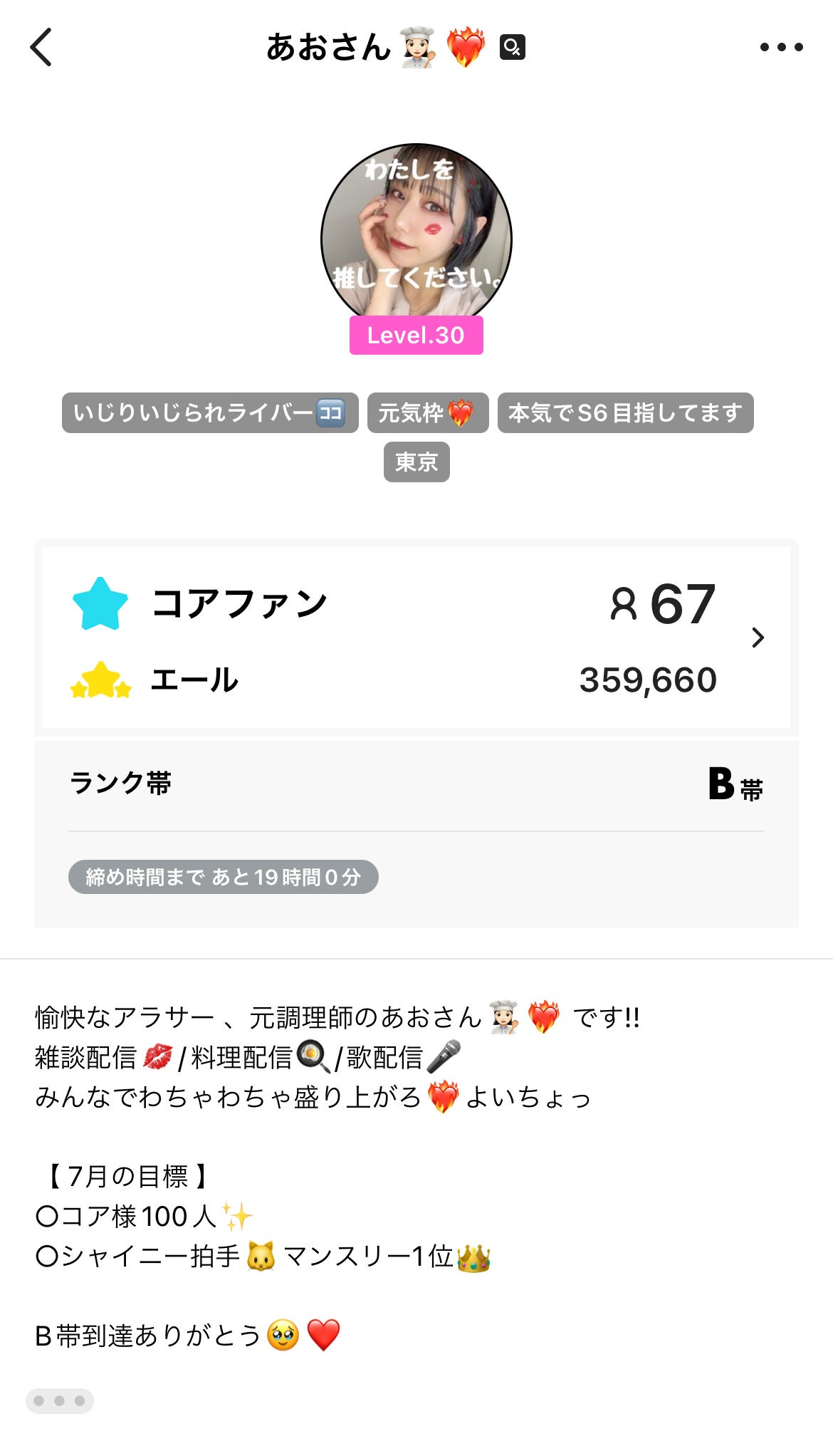 国内最大級ライブ配信事務所LIVEwith「ライブウィズ」所属ライバー『あおさん👩🏻🍳❤️🔥』が7月開催事務所イベント【ウィークリー応援ポイント獲得イベント(C1~C3)】での優勝をお知らせします。
