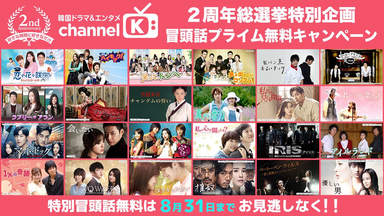 2周年を迎える「チャンネルK」が自信を持ってお届けする“観て後悔しない人気韓国ドラマ“の冒頭話が無料で視聴できるキャンペーンは本日8月8日(月)から8月31日(水)までとなっていますので、2周年総選挙とあわせてお楽しみください!