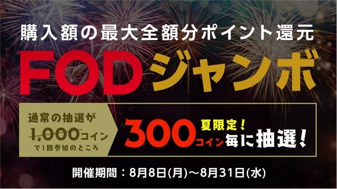 「FODジャンボ」とは、FODプレミアム会員の方限定で、FODにて電子書籍購入時に一度に1,000コイン以上使用すると、一定の確率でFOD商品券が当たるキャンペーンとなっております。通常では一度に1,000コイン以上の使用が対象となりますが、期間限定で300コイン使用で抽選に参加が可能です。