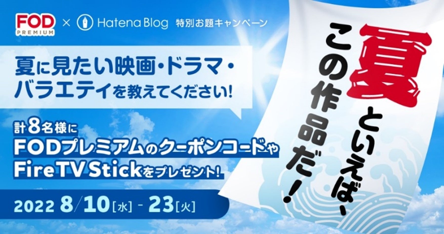 「はてなブログ」にてFODの特別お題キャンペーンを実施!期間中、「#夏に見たい映画・ドラマ・アニメ・バラエティ」をお題にしたブログ投稿を募集!グランプリ、FOD賞をはじめ選出された方には全8名の方にはFODクーポン1年分などの豪華賞品をプレゼント。皆様のご応募をお待ちしています。