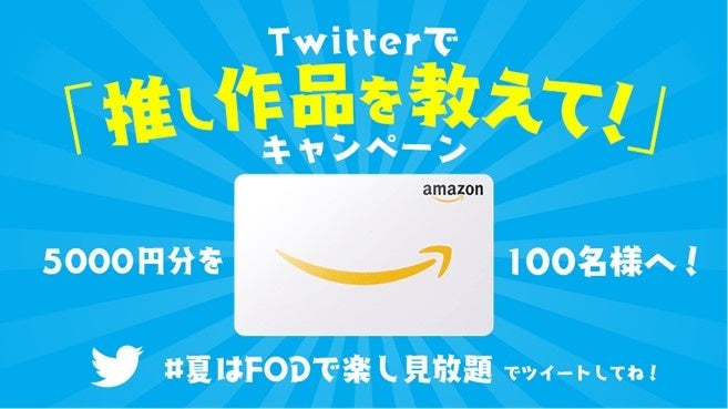 期間中、夏だから観たくなるおすすめのFOD作品名とその理由をご紹介いただき「#夏はFODで楽し見放題」をつけてキャンペーン投稿を引用RTしていただくと、抽選で100名様にAmazonギフト券5000円分をプレゼントいたします。