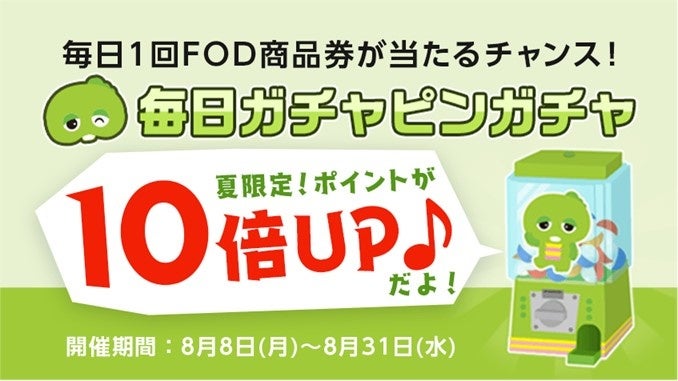 FODプレミアム会員の方限定で、毎日1回参加できるハズレなしの「毎日ガチャピンガチャ」が期間限定でポイントアップします。獲得できるすべてのポイントがなんと10倍に!ぜひこの機会に参加してください。