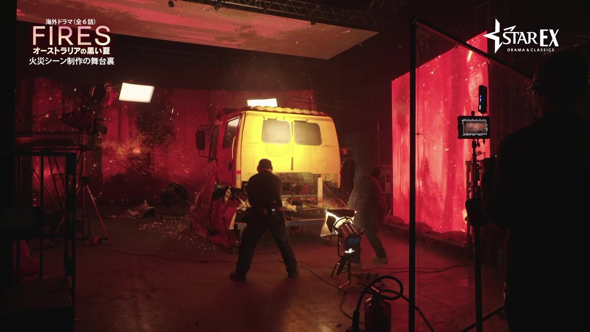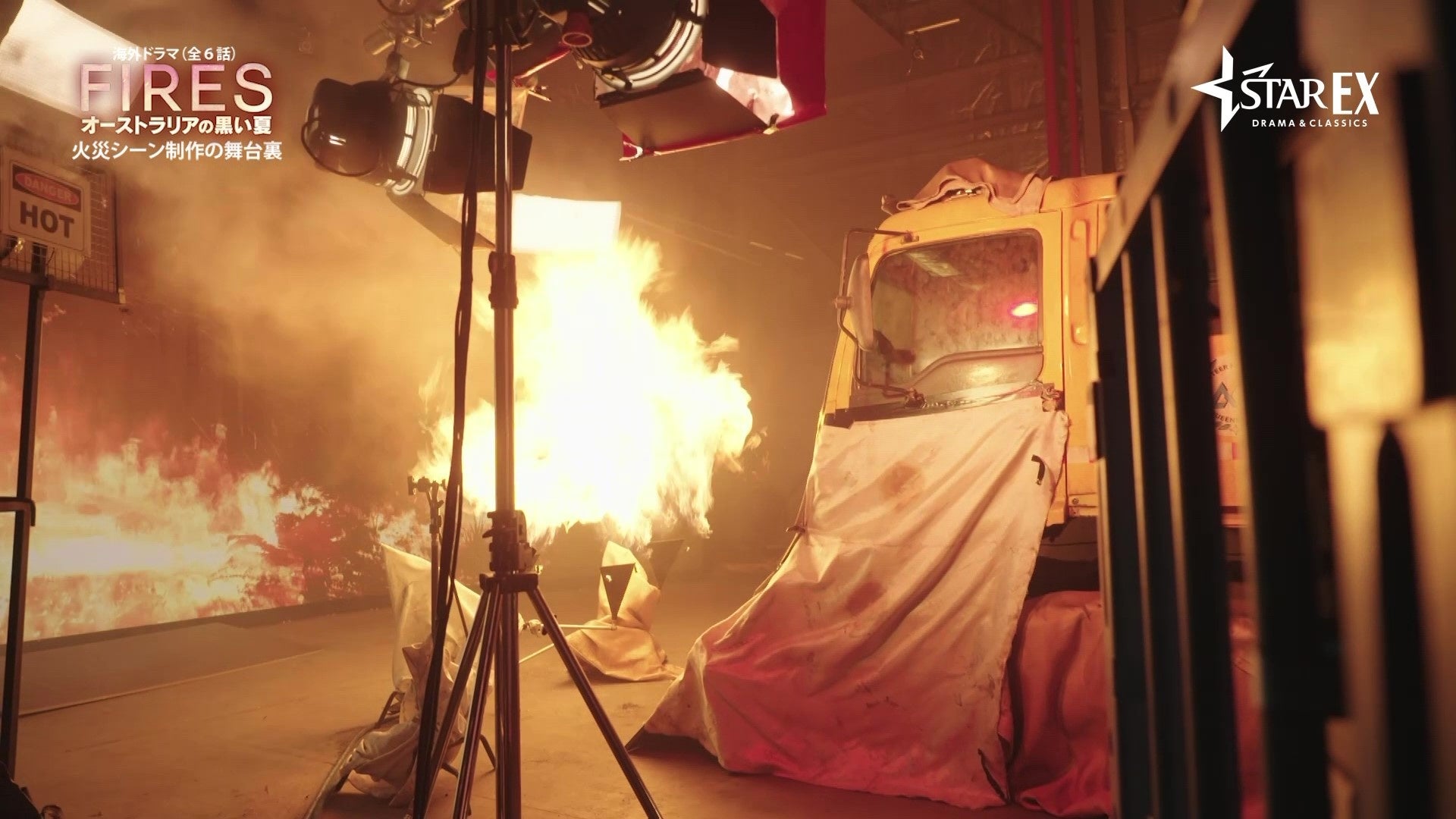 今回解禁となったのは、第一話のクライマックスで若い消防団員2名が消防車の中に取り残され、火に囲まれてしまうという緊迫感のあるシーンのメイキング映像。こちらのシーンで用いられたのは「ドリームスクリーン」と呼ばれる最新技術。通常背景にCGを合わせるシーンではグリーンスクリーンの前で撮影し、後で背景を合成するのが主流だが、ドリームスクリーンは一面が巨大なLEDパネルになっており、リアルな炎の映像を背景に撮影するが可能となった。それに合わせて火の粉や風は本物を使用。わずか5分のシーンに3日間かけて撮影し、より臨場感のあるシーンに仕上がった。