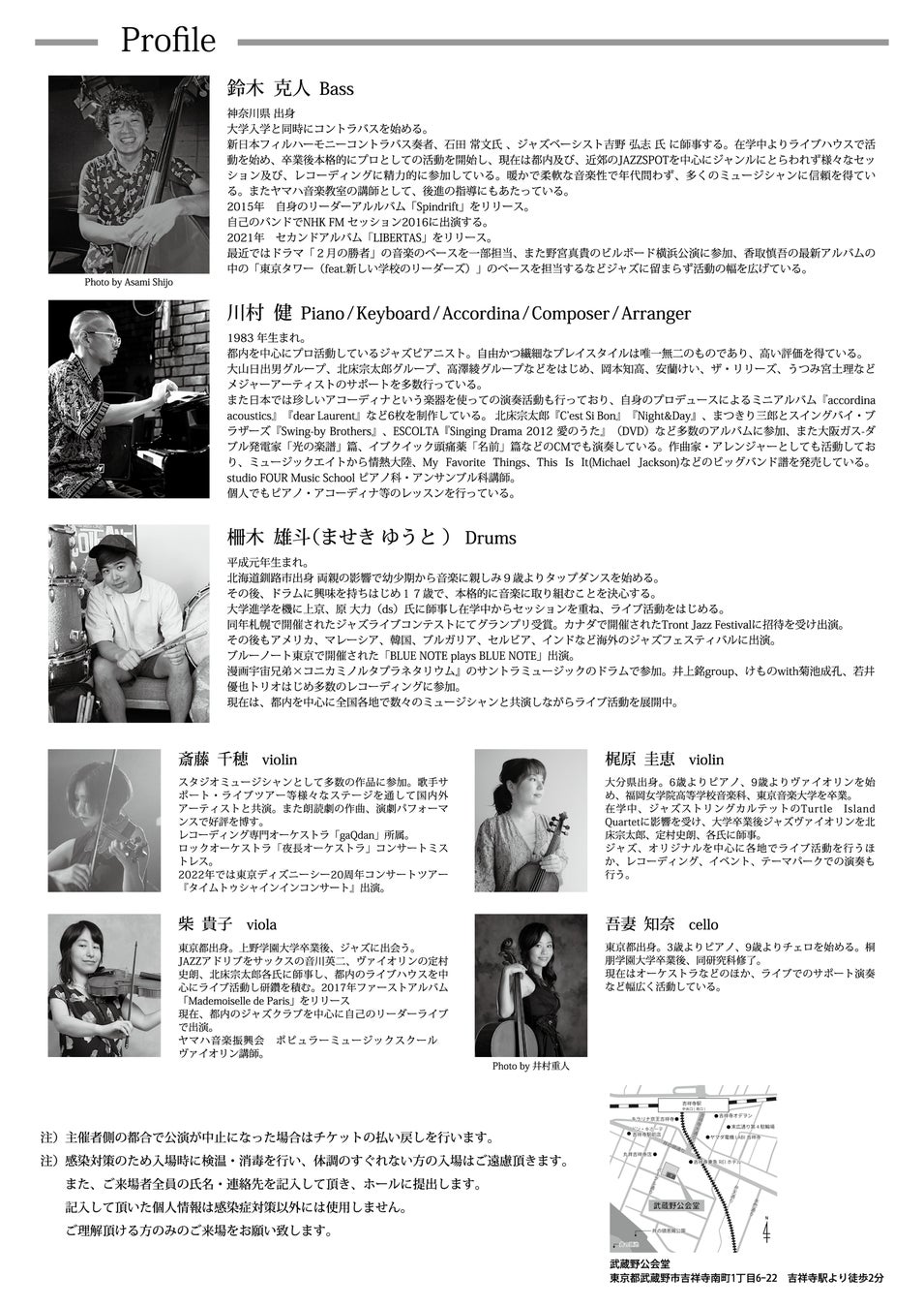 音楽集団 空 主催、『オータムジャズコンサート ピアノトリオと弦楽四重奏の夕べ』が2022年11月11日 (金)に武蔵野公会堂(東京都武蔵野市吉祥寺南町1丁目6番22号)にて開催されます。