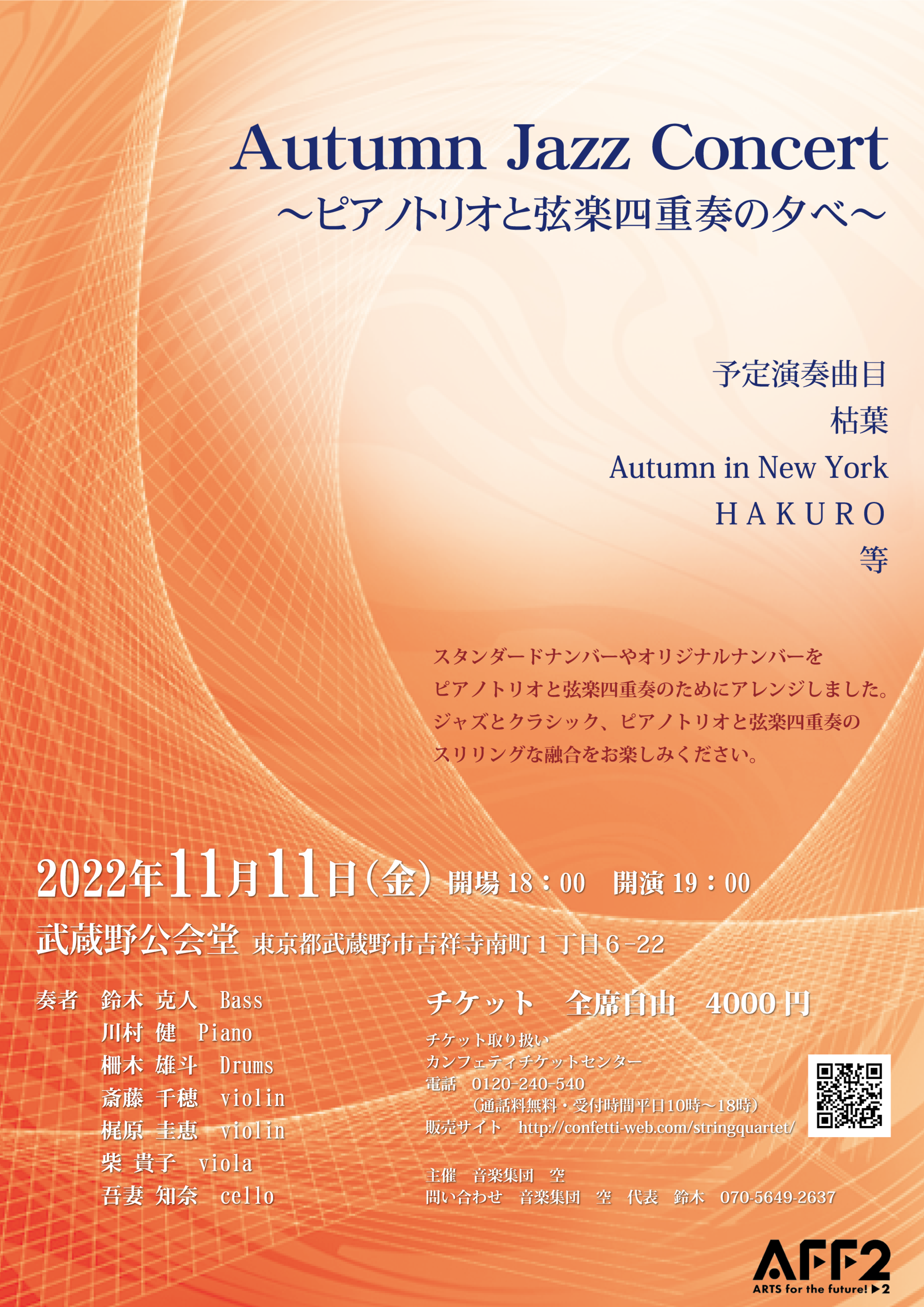 音楽集団 空 主催、『オータムジャズコンサート ピアノトリオと弦楽四重奏の夕べ』が2022年11月11日 (金)に武蔵野公会堂(東京都武蔵野市吉祥寺南町1丁目6番22号)にて開催されます。