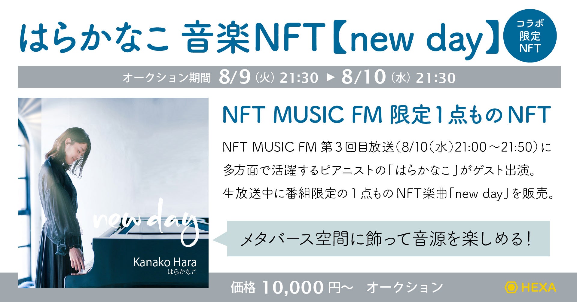 ピアニスト・作曲家の「はらかなこ」さんがNFTラジオ番組「NFT MUSIC FM」との限定コラボ音楽NFT 『new day』をHEXA(ヘキサ)で販売します。「はらかなこ」さんは8月10日(水)21時~21時50分に放送されるNFT MUSIC FMにゲスト出演し、生放送中にオークションが終了します。