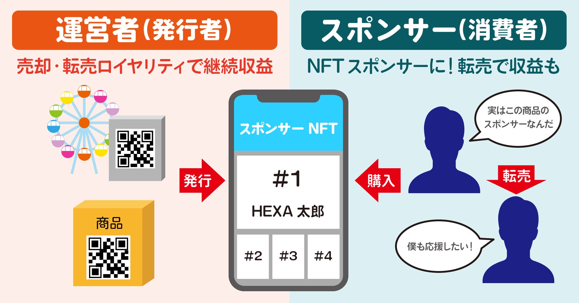 消費者・ユーザーが商品・サービスのNFTを購入してスポンサーになる事ができます。商品が有名になるとスポンサーNFTの価値が上昇する可能性があり、消費者は転売によって利益を得ることができます。さらに転売額の最大10%がロイヤリティとして発行元に還元されるため、転売が応援になります。消費者と一緒に商品の販売を拡大し、共に利益が得られるWEB3.0の考え方をリアルでも実現するサービスとなります。