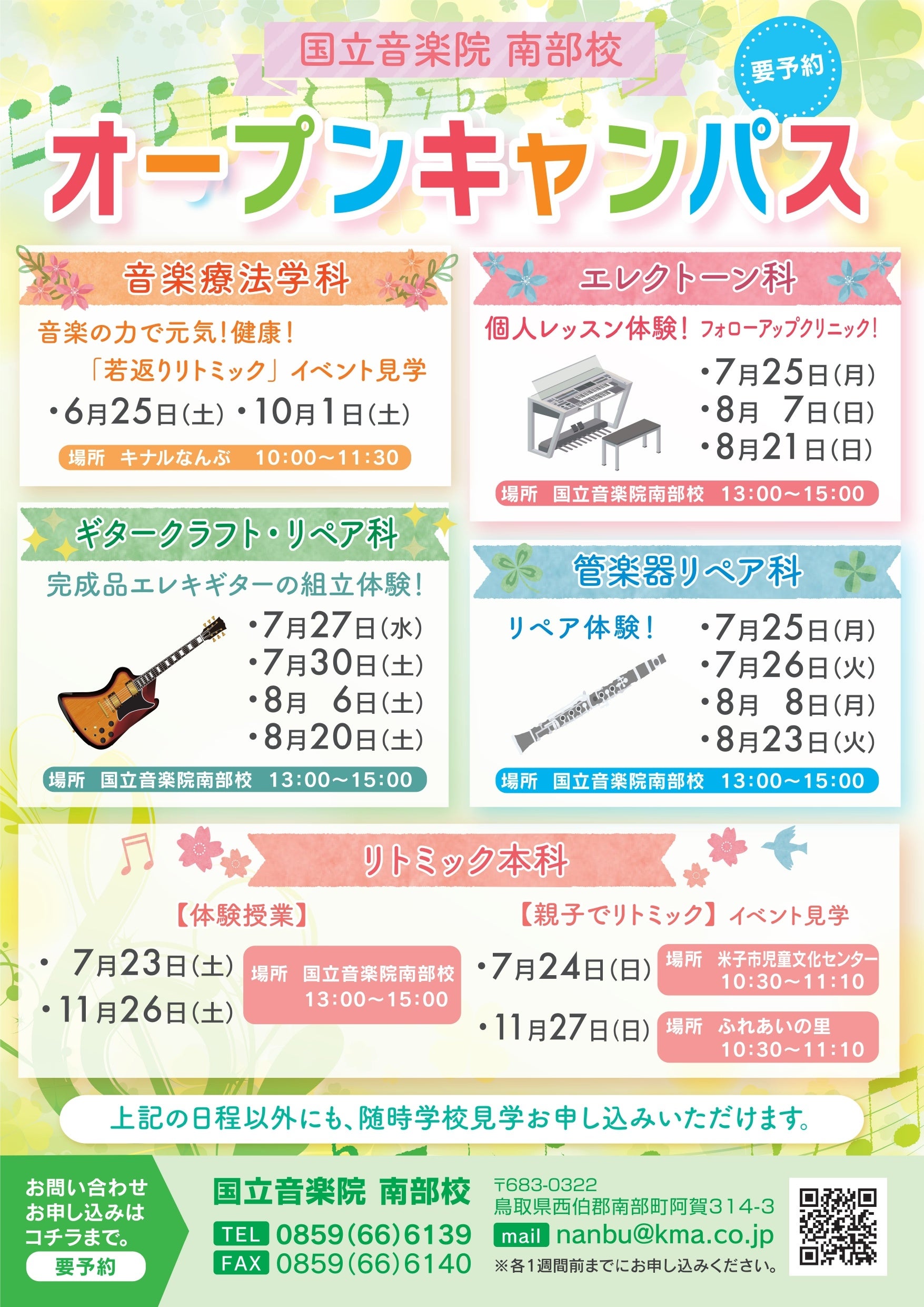オープンキャンパスでは既にご紹介したエレクトーン科・リトミック本科のほか、即興演奏の力や心理学・医学 を学び音楽を福祉の分野で活かす人材を育てる音楽療法学科、楽器の修理や調整、製作の分野から地域の音楽活 動へ貢献できる人材を育てる管楽器リペア科・ギタークラフトリペア科の体験イベントも開催いたします。