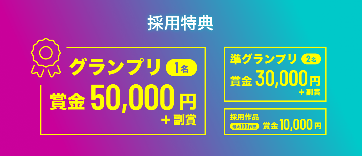 二次選考にてご応募いただいた全作品の中から、最大100点を採用作品として発表し、さらにその中から優秀作品を選出する予定となっております。採用特典として、グランプリ1名に賞金5万円+副賞、準グランプリ2名に賞金3万円+副賞、採用作品(最大100点)には賞金1万円を授与いたします。