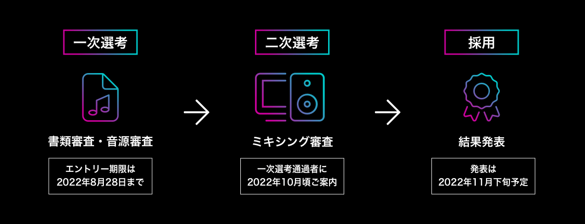 一次選考では、書類選考及びこれまでの制作実績を元にしたミキシングスキルの審査を行い、二次選考のミキシング審査へ進んでいただく方を選考します。二次選考では、『もしもあなたが、配信ライブミックスのエンジニアになったなら』というお題に則り、実際のシチュエーションを想定してミキシングしていただいた作品について審査を行います。