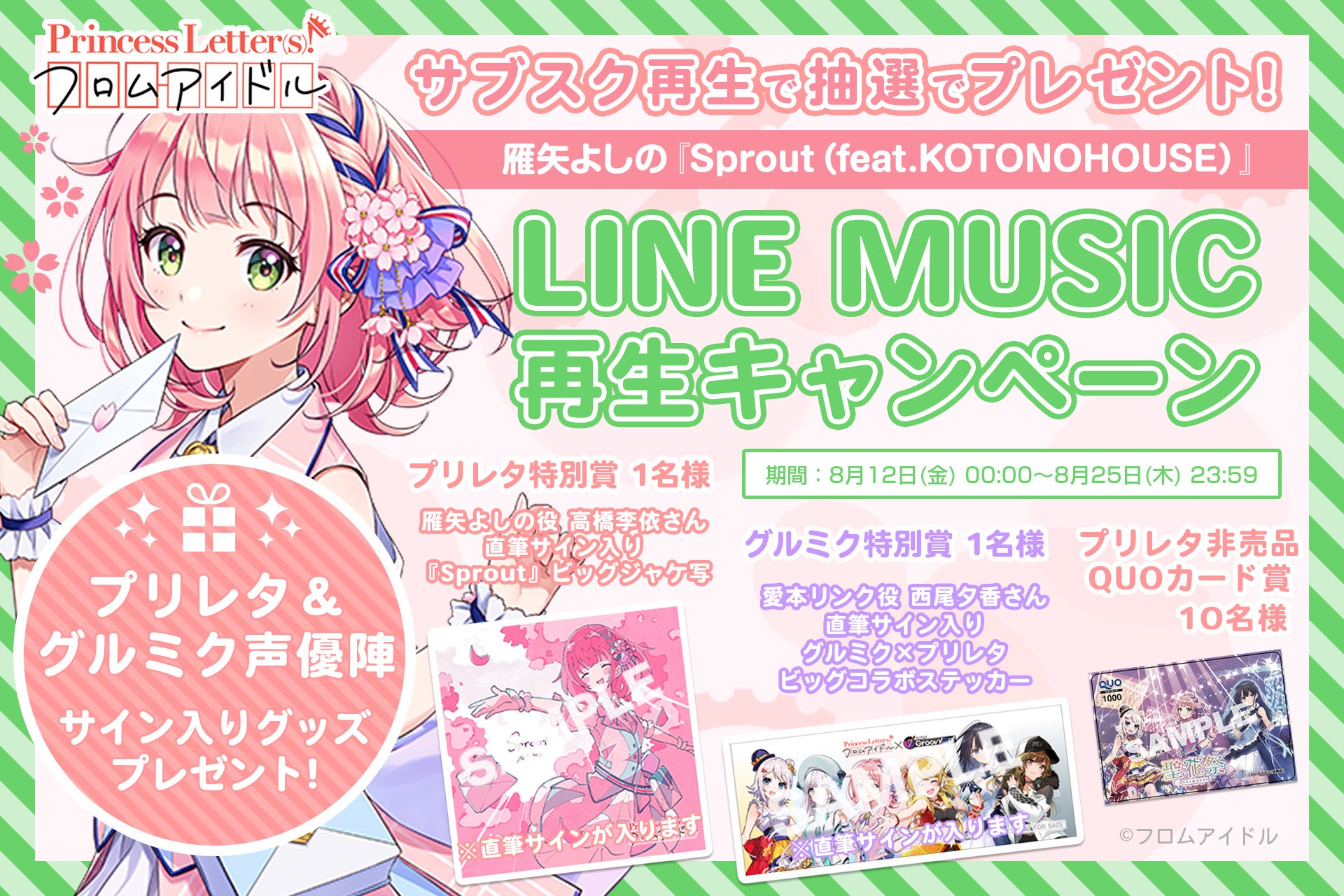 8月12日(金)24:00までの間に、「LINE MUSIC」上のランキング「ミュージックビデオ Top 100」で10位以内に入った場合は、応募者より抽選で各1名様に雁矢よしの役「高橋李依」さん直筆サイン入り『Sprout(feat. KOTONOHOUSE)』ビッグジャケ写または、愛本りんく役「西尾夕香」さん直筆サイン入り「グルミク×プリレタ」ビッグコラボステッカーをプレゼント!
