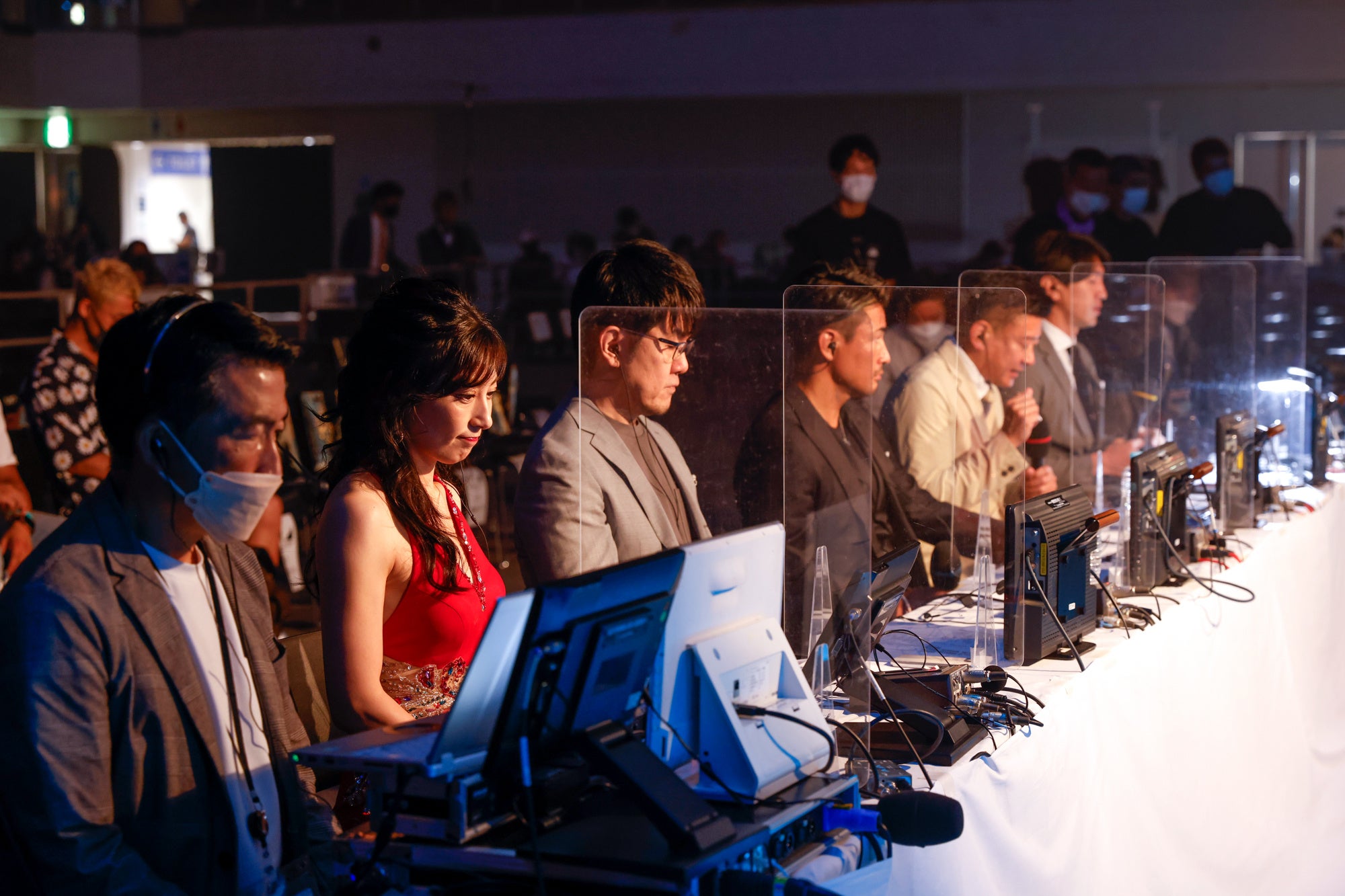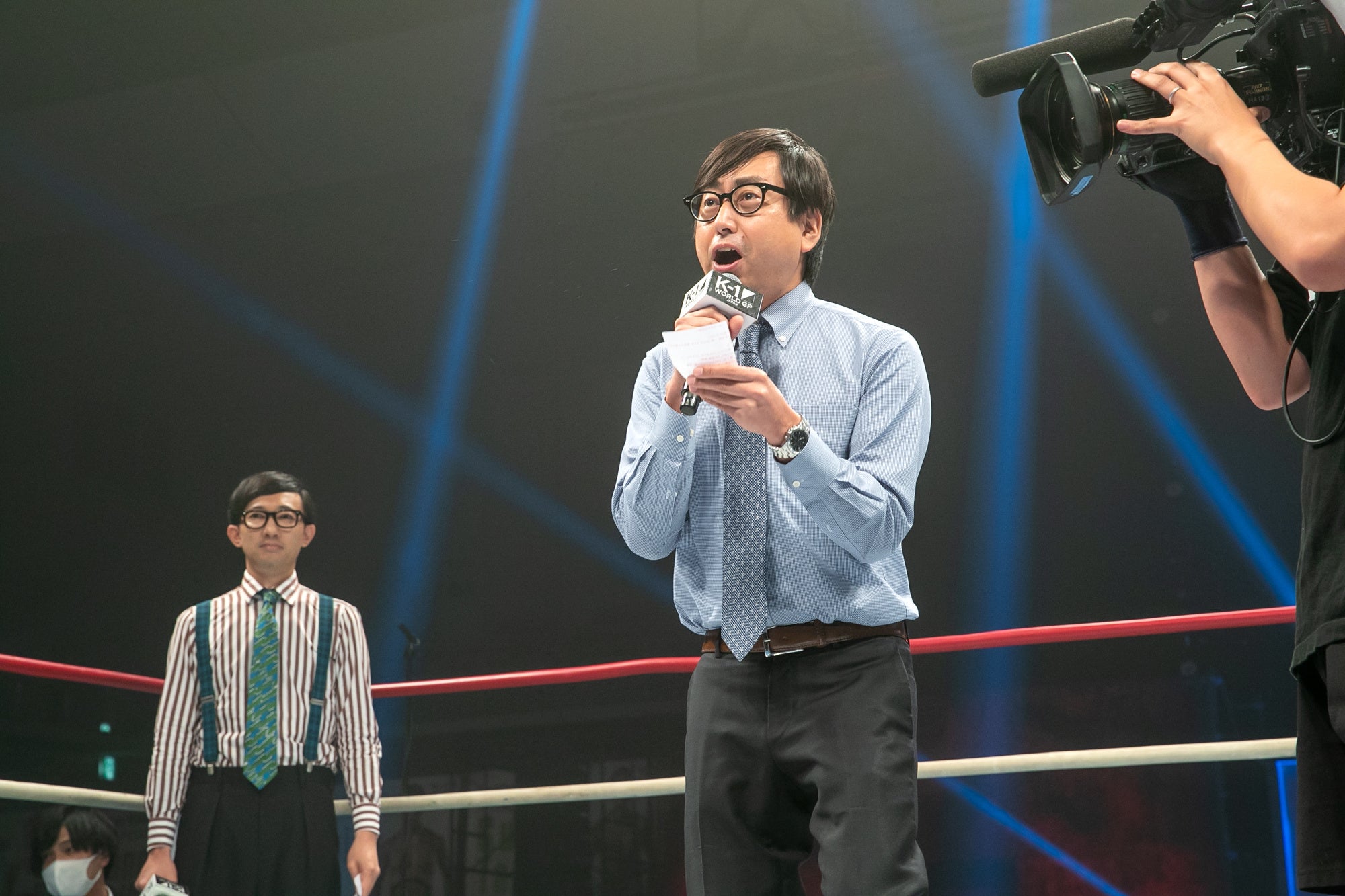 最後に、スペシャルリングアナをされたおいでやすこがのお二人に、お互いを100点満点で採点するなら何点かを伺うと、こがけんさんは「…56点ですね。壬生狼選手の名前を声が割れるくらい大きな声で叫んだじゃないですか。あのあとの、ジャッジの方たちは、とても冷静に名前を言ったんですよ。僕は全叫びで言ってほしかったですね。そういう意味で56点です。」と呆れた顔で採点するこがけんさんに対し、小田さんは「ふざけるな!」と切り込み、「こがけんは、20点くらい。」と採点の理由も伝えずに、ばっさりと評価しました。