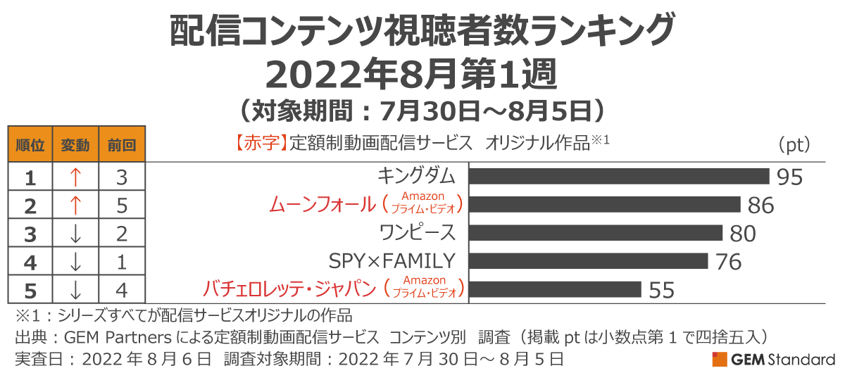 エンタテイメント業界に向けたデータ×デジタルマーケティングサービスを提供するGEM Partners株式会社(ジェムパートナーズ、所在地:東京都港区、代表取締役:梅津文)は8月12日(金)、複数の定額制動画配信サービスを横断して集計した2022年8月第1週の「配信サービス視聴者数ランキング(調査対象期間:7月30日~8月5日、調査対象:日本在住15~69歳男女)」を発表します。