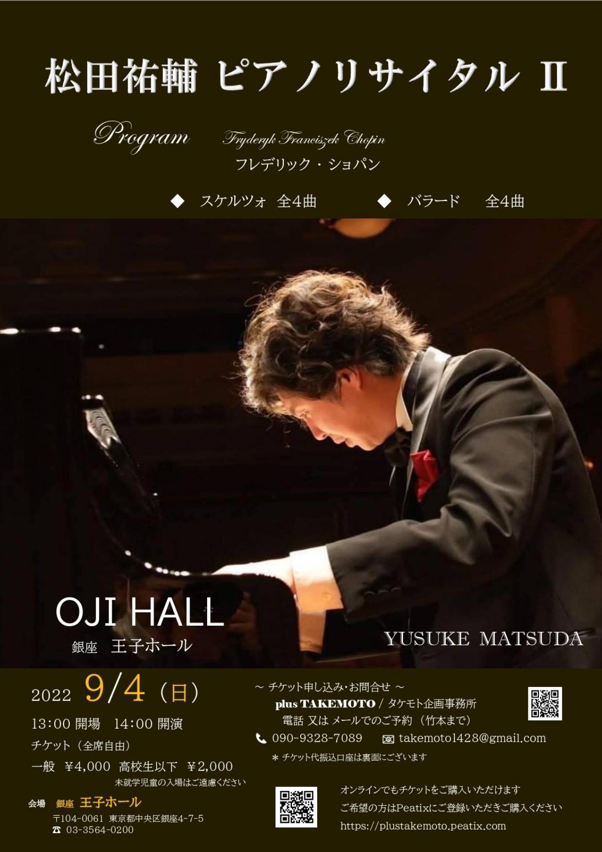 タケモト企画事務所主催、『松田祐輔ピアノリサイタルⅡ』が2022年9月4日 (日)に銀座 王子ホール(東京都中央区銀座4-7-5)にて開催されます。