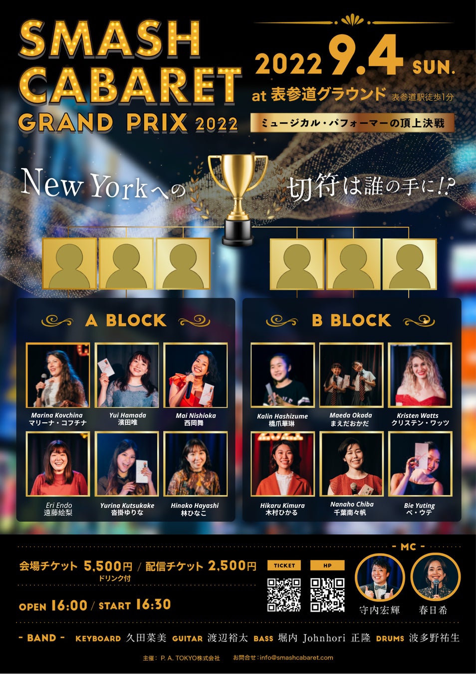 ミュージカル・パフォーマーの頂上決戦「SMASH CABARET」(スマッシュ・キャバレー)を毎月開催している株式会社P. A. TOKYO(所在地:東京都目黒区、代表取締役:堂本麻夏)は、「SMASH CABARET」の年間チャンピオンを決める「SMASH CABARET グランプリ 2022」を、2022年9月4日に表参道グラウンドにて開催します。