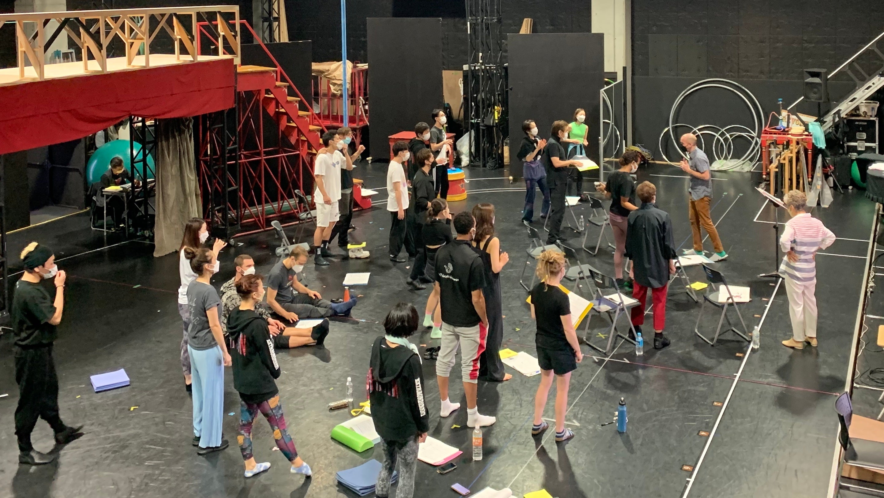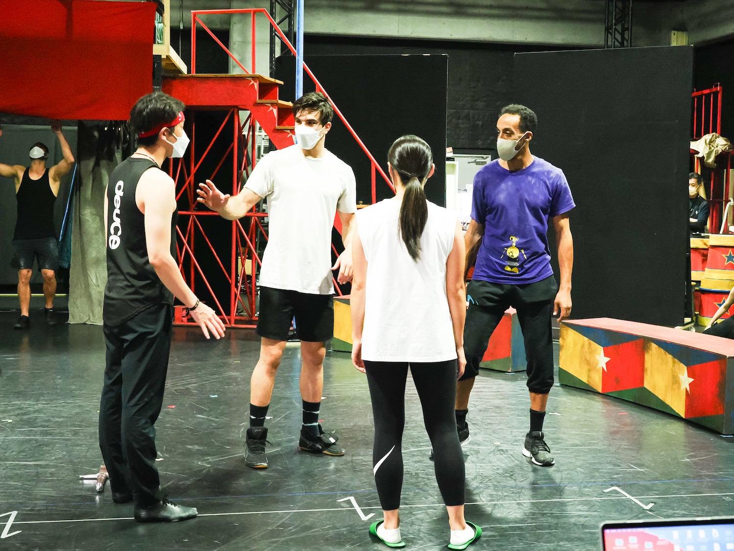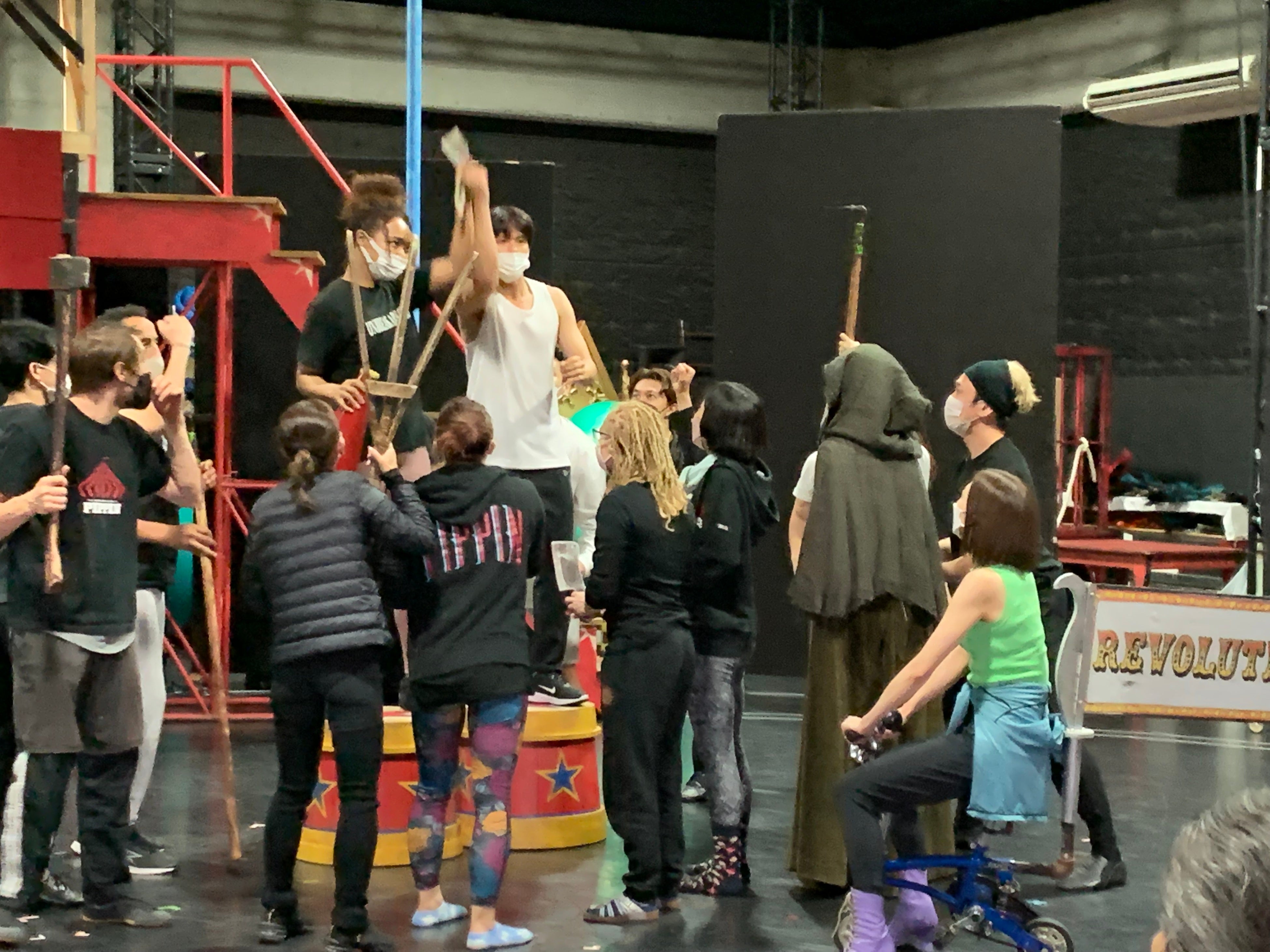 次の稽古は、演出補Mahlon Kruseを中心にステージングが進められた。リーディングプレイヤーに見せられた新聞記事をきっかけに、父チャールズに反旗を翻す場面。ピピンは農民たちを鼓舞して、革命へと促していく。「農民はひとり100人分演じると思って」とより熱量を求められる。続く場面は、ファストラーダがチャールズとピピンが対立するように企む場面。大きなBOXを使ったイリュージョンや、ナイフ投げも見どころで、よりスムーズに展開してメリハリがつくように、ブラッシュアップしていく。