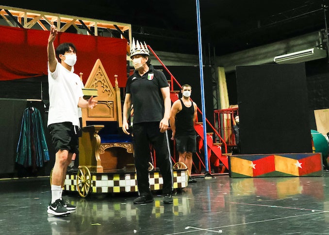 8月30日(火)の開幕に向けて稽古が進んでいる、ミュージカル『ピピン』稽古場レポートをお届けする。本番仕様の仮セットが組まれた稽古場に入ると、そこはまさにサーカス小屋のよう。至る所でトレーニングが行われている。息を吸うように繰り広げられるアクロバット。サーカス・レプリケーターのKai Johnson-Peadyが中心となって、技がブラッシュアップされていく。最初に行われたのは、クリスタル・ケイが演じるリーディングプレイヤーのソロナンバー「SIMPLE JOYS」。サーカスチームによるバランスボールとフラフープを使ったアクロバットを、クリスタルの歌に併せて確認していく。クリスタルは、「体が覚えていて結構スムーズに進んでいる」と余裕がありそうな様子。