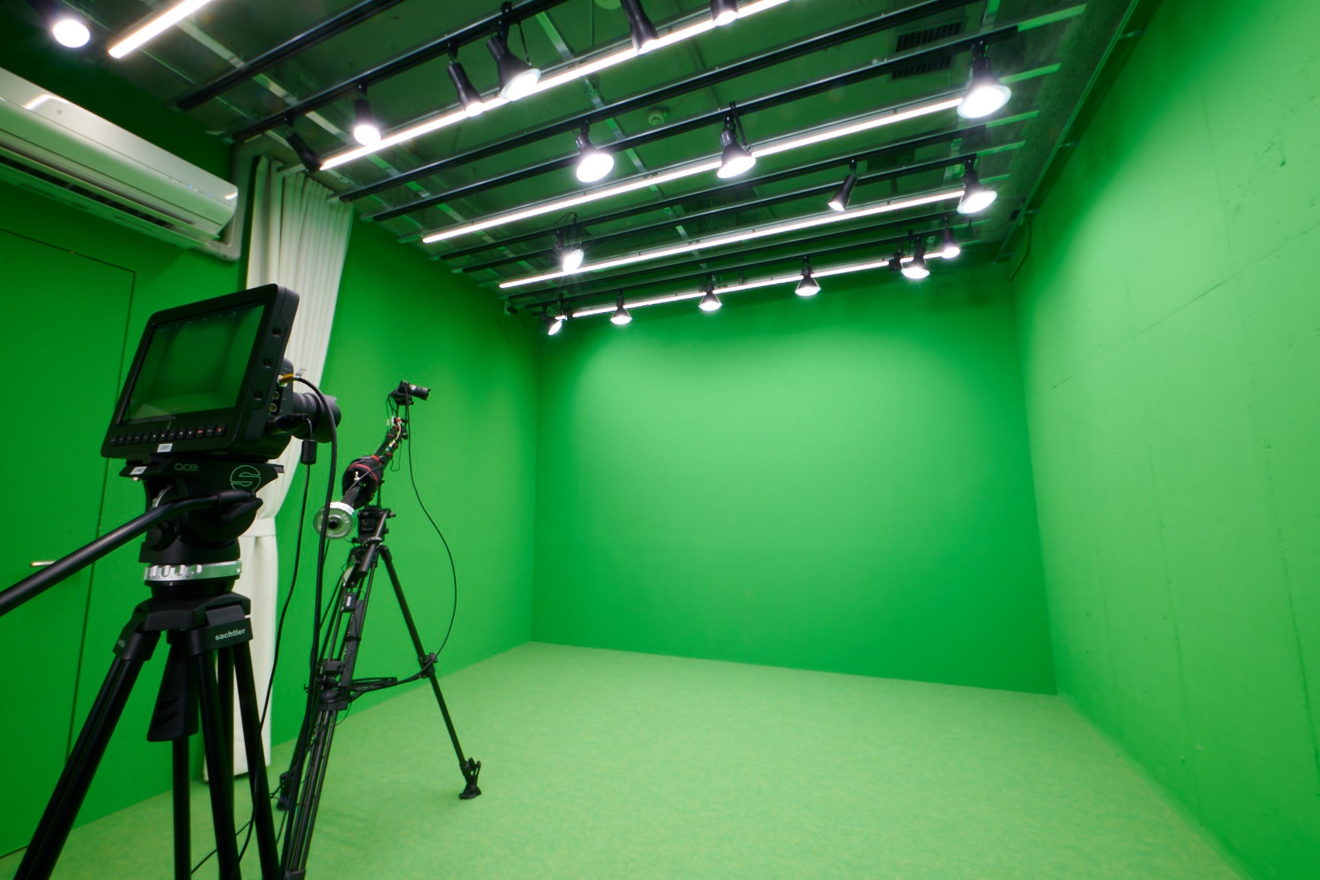 ▼幅4m × 奥行5mの4面グリーンバックスタジオで、出演者1~3名程度が最適な広さ。