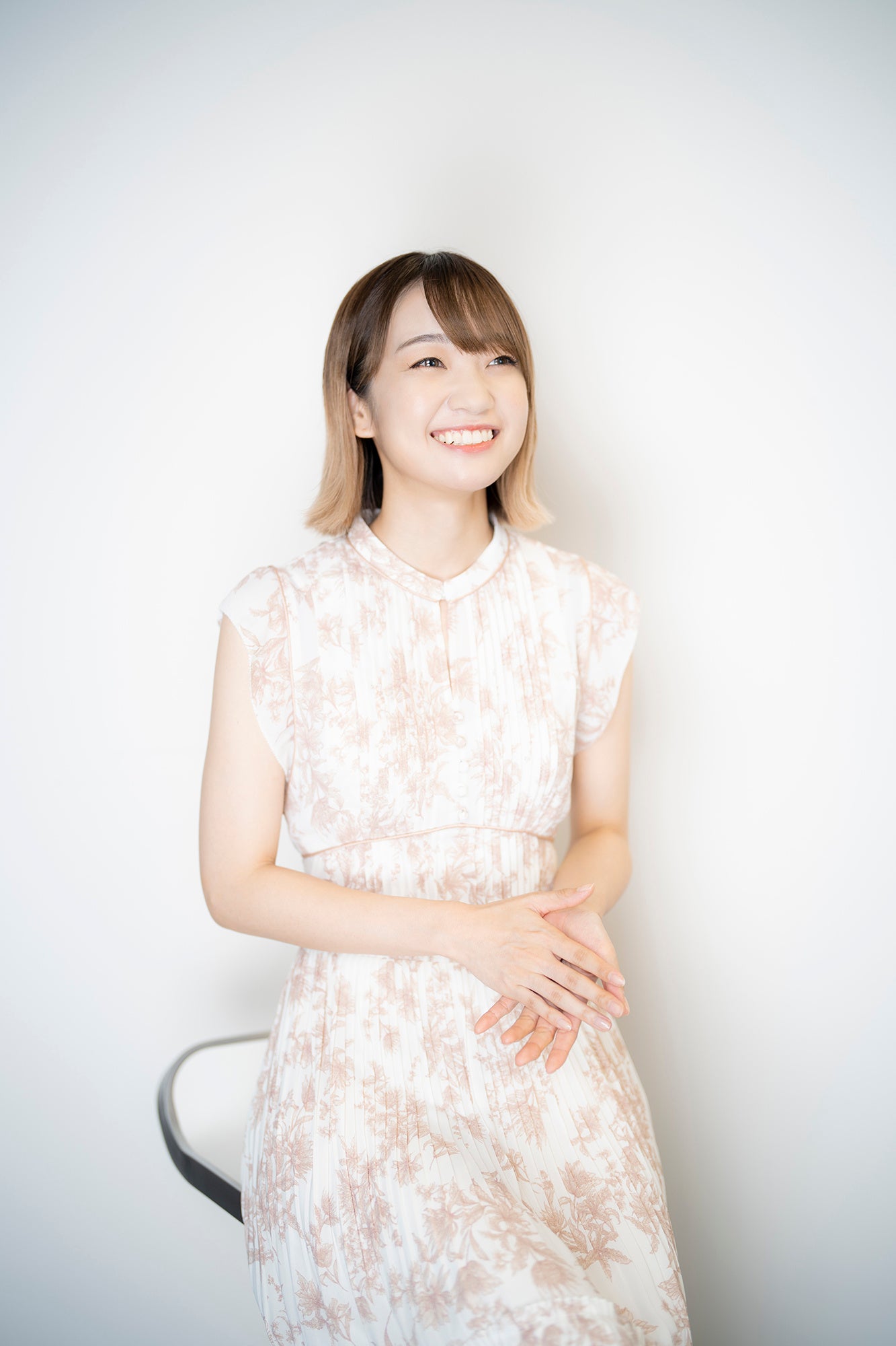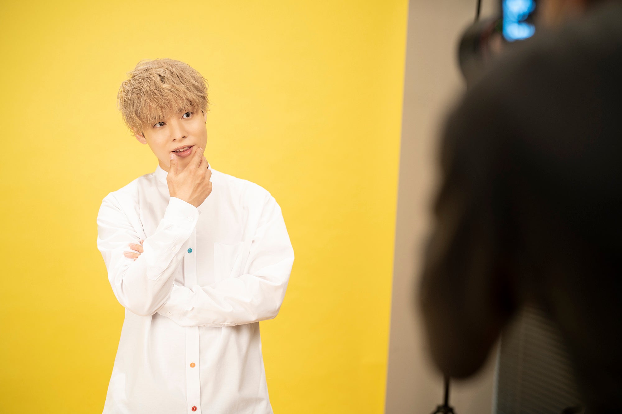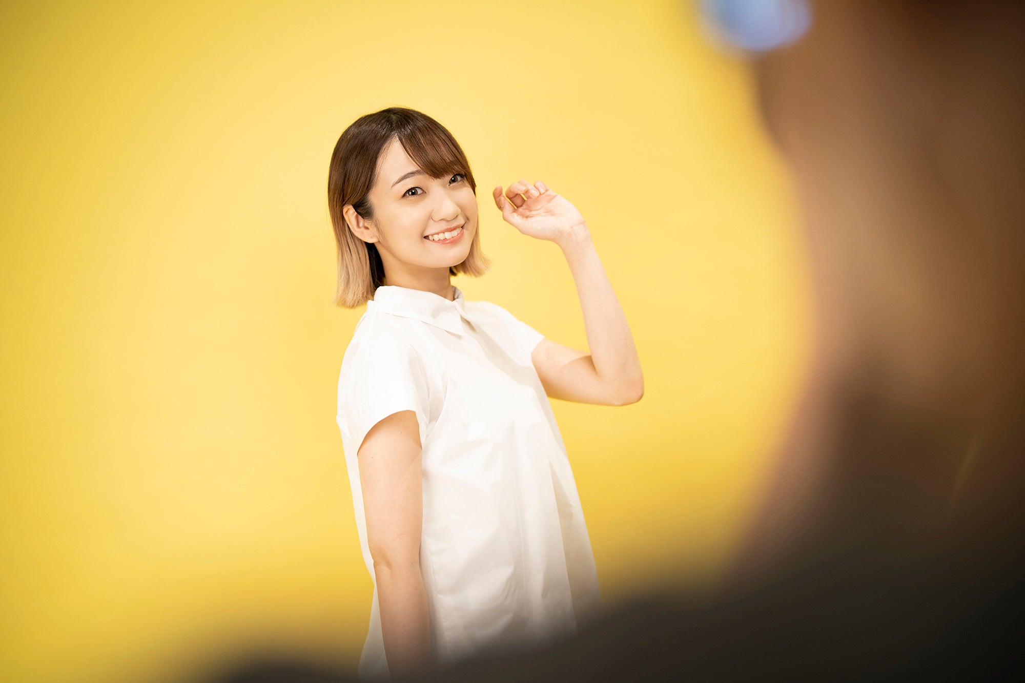 爽やかな白の衣装に着替えて、いよいよパンフレット用の写真撮影がスタート!背景は、タイトルに合わせて“ハニーレモン”色。