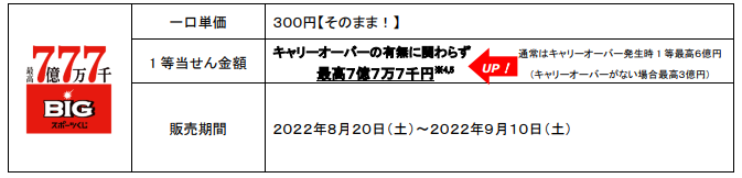 ※5:特別なBIGの前後の開催回は、通常のBIGとして、キャリーオーバー発生時1等最高6億円(キャリーオーバーがない場合最高3億円)となります。なお、当せん金は、売上金額や当せん口数によって変動します。