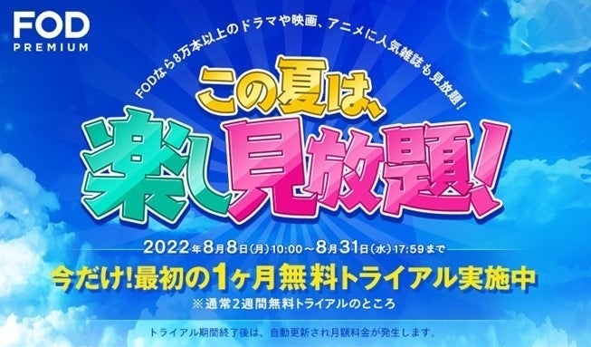 「この夏は、楽し見放題!」キャンペーンは、夏だから観たくなるドラマ、ホラー、アニメの人気作や名作などをピックアップし、FODプレミアムをお得に楽しめるキャンペーンです。期間中にキャンペーン特設WEBサイトまたはFODのWEBサイトのトップページから、FODプレミアムに入会すると、通常2週間の無料トライアルが1ヵ月間無料で見放題となります。