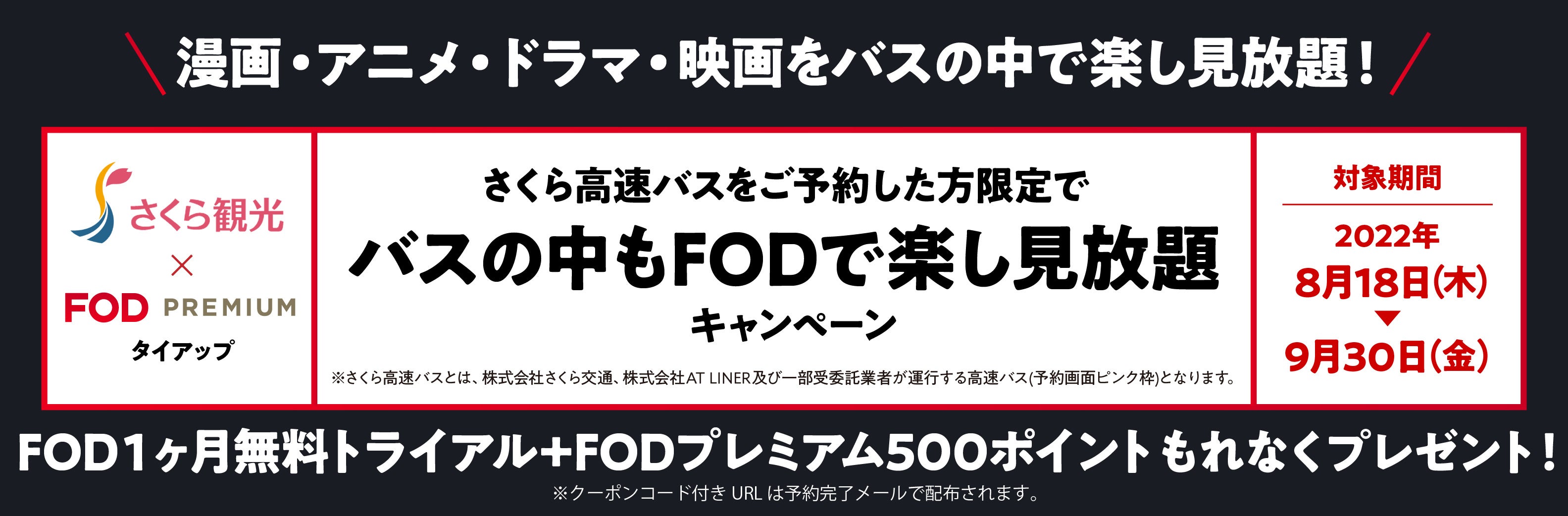 対象期間中に株式会社さくら交通、株式会社AT LINER及び一部受委託業者が運行するさくら高速バスをご予約いただいた方限定で、FODプレミアム1ヵ月間無料トライアルに加えて、最新映画・人気番組のレンタルや漫画・書籍の購入に利用できるFODプレミアムポイント500ポイントをもれなくプレゼントします。