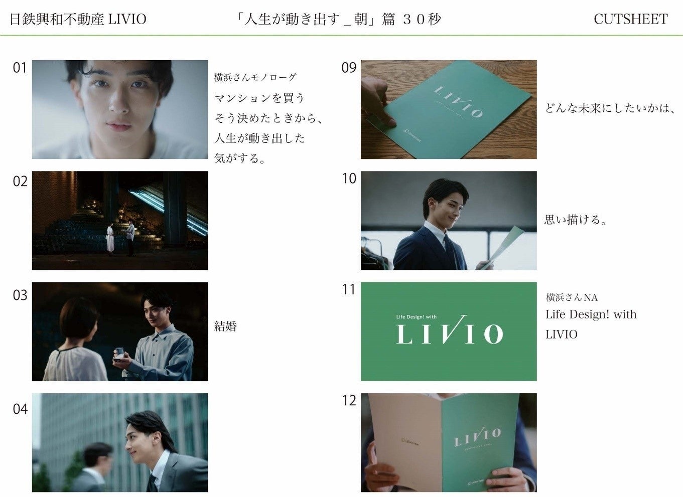 人生初のマンション購入を決心した主人公(横浜流星さん)の朝の身支度のシーンからストーリーは始まります。やわらかな朝の光の中、洗面台の前で鏡を見つめる主人公の心の声とシンクロするように、「結婚」「仕事」「家族」…と、主人公が思いを馳せる未来のシーンが描き出されます。「よしっ」とスーツ姿に身支度を終え、『LIVIO(リビオ)』のパンフレットを手に会社へ。いつもの朝をいつもとは少し違った前向きな気持ちとともに歩み出す主人公です。